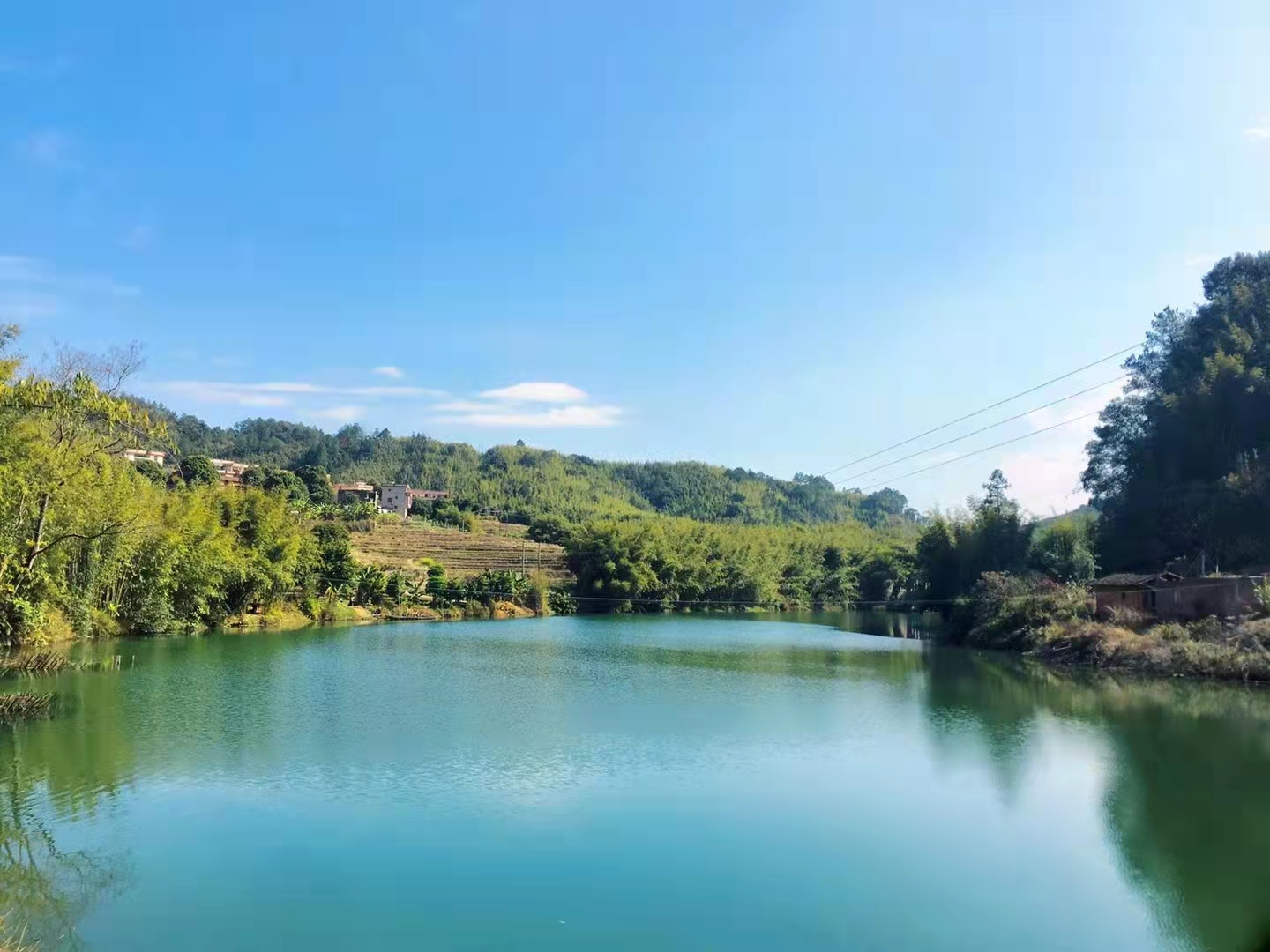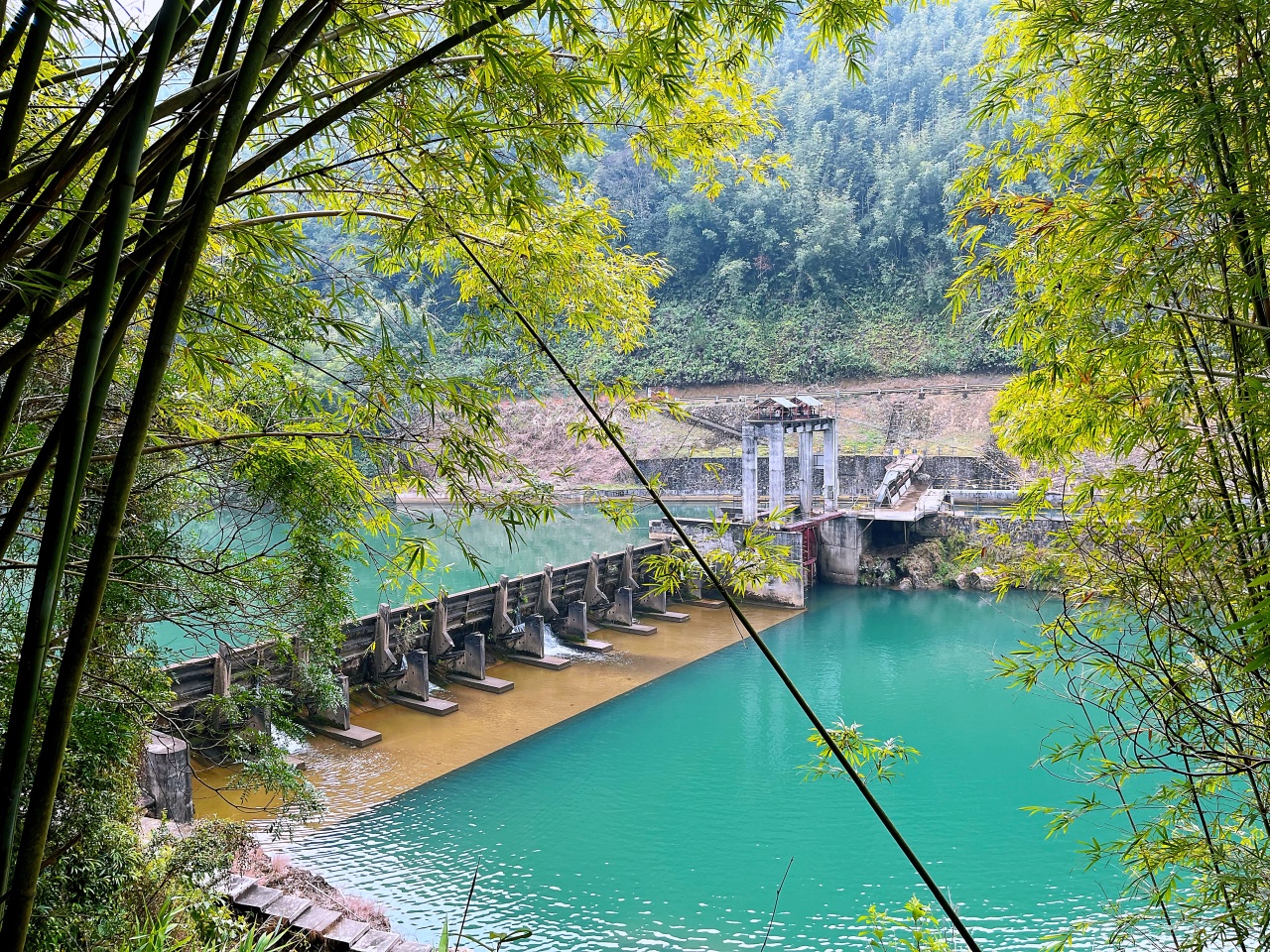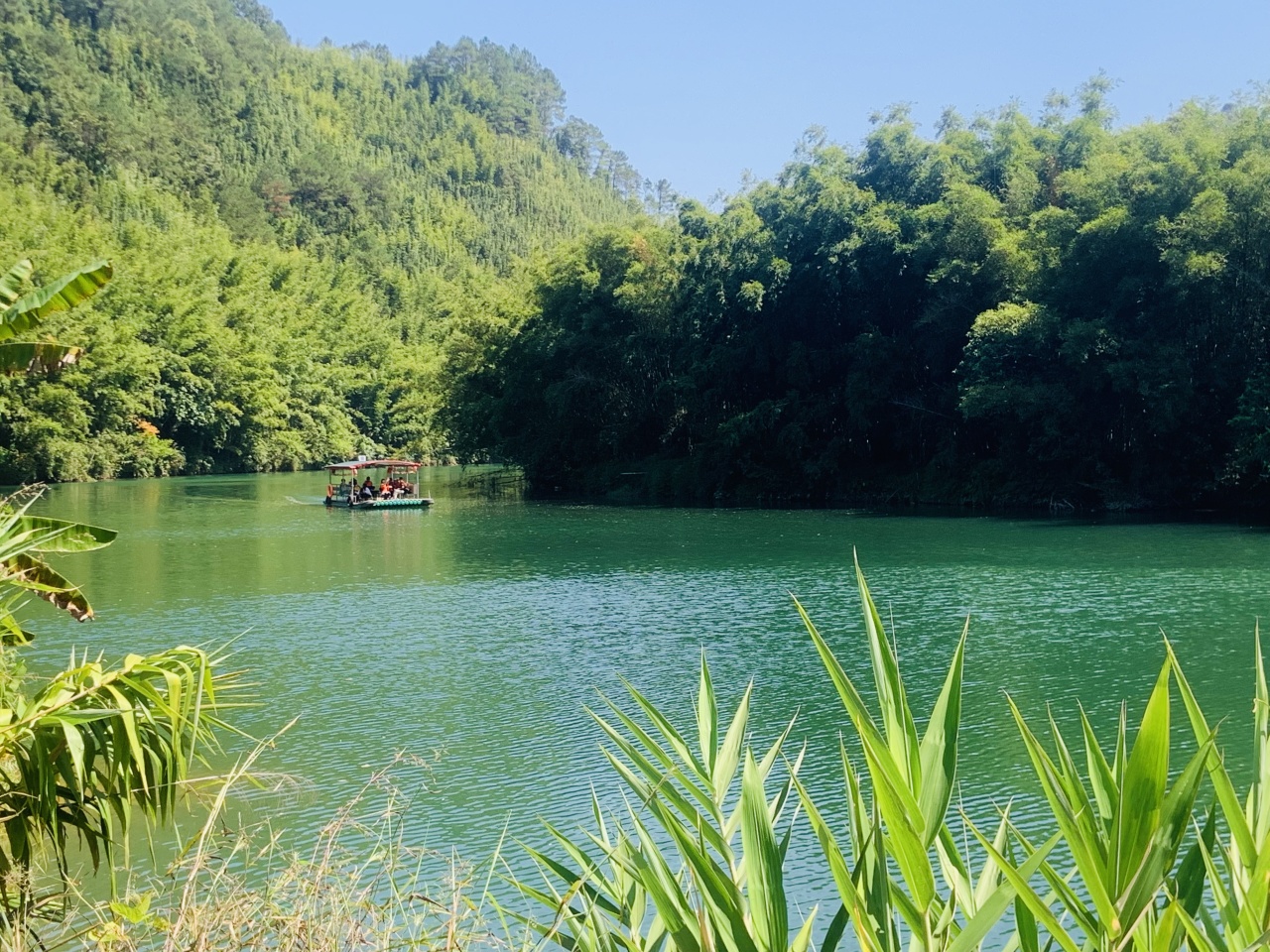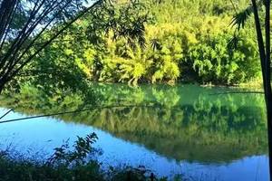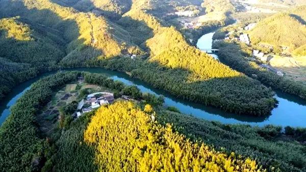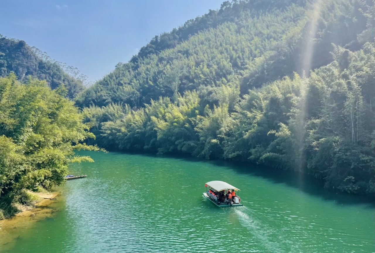沿途苍翠绵延竹海、田园风光、九曲十八弯古水河,
