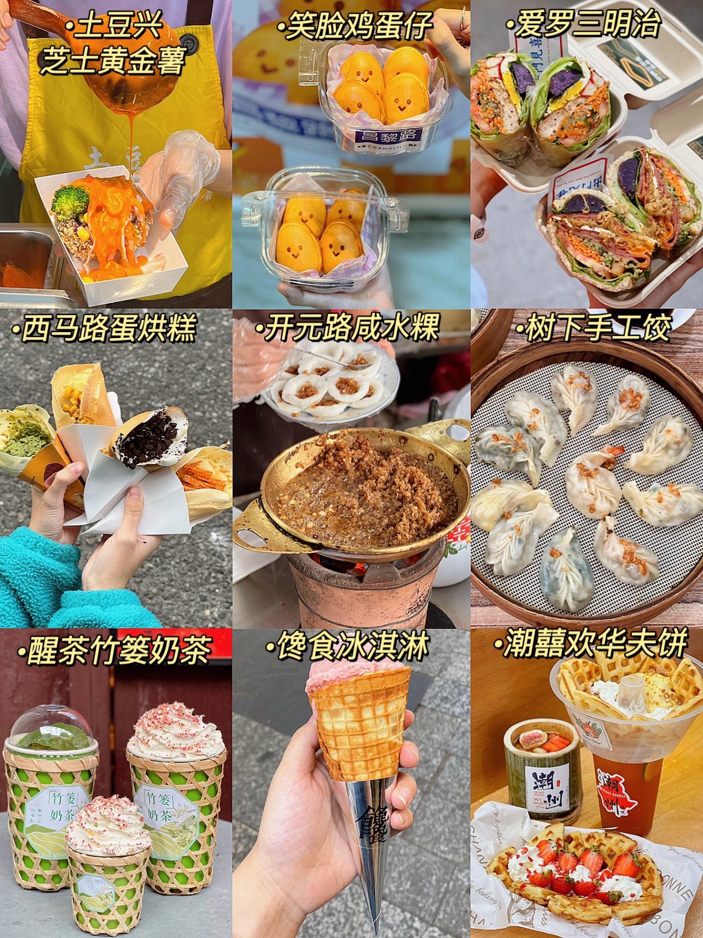 牛肉丸、蚝烙、卤鹅、生腌海鲜、肠粉、五果汤、牛杂粿条、甘草水果……