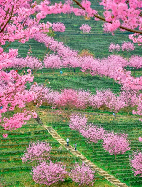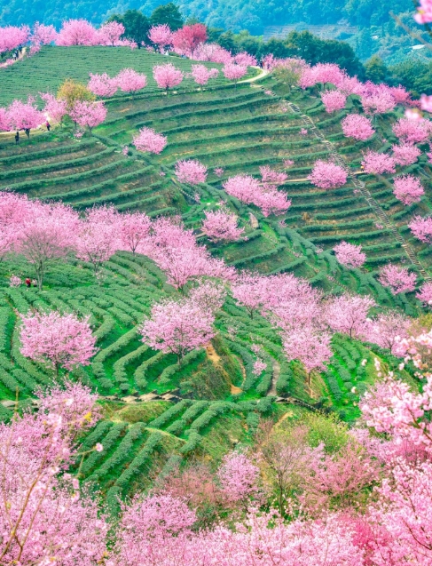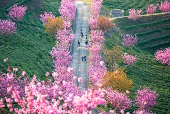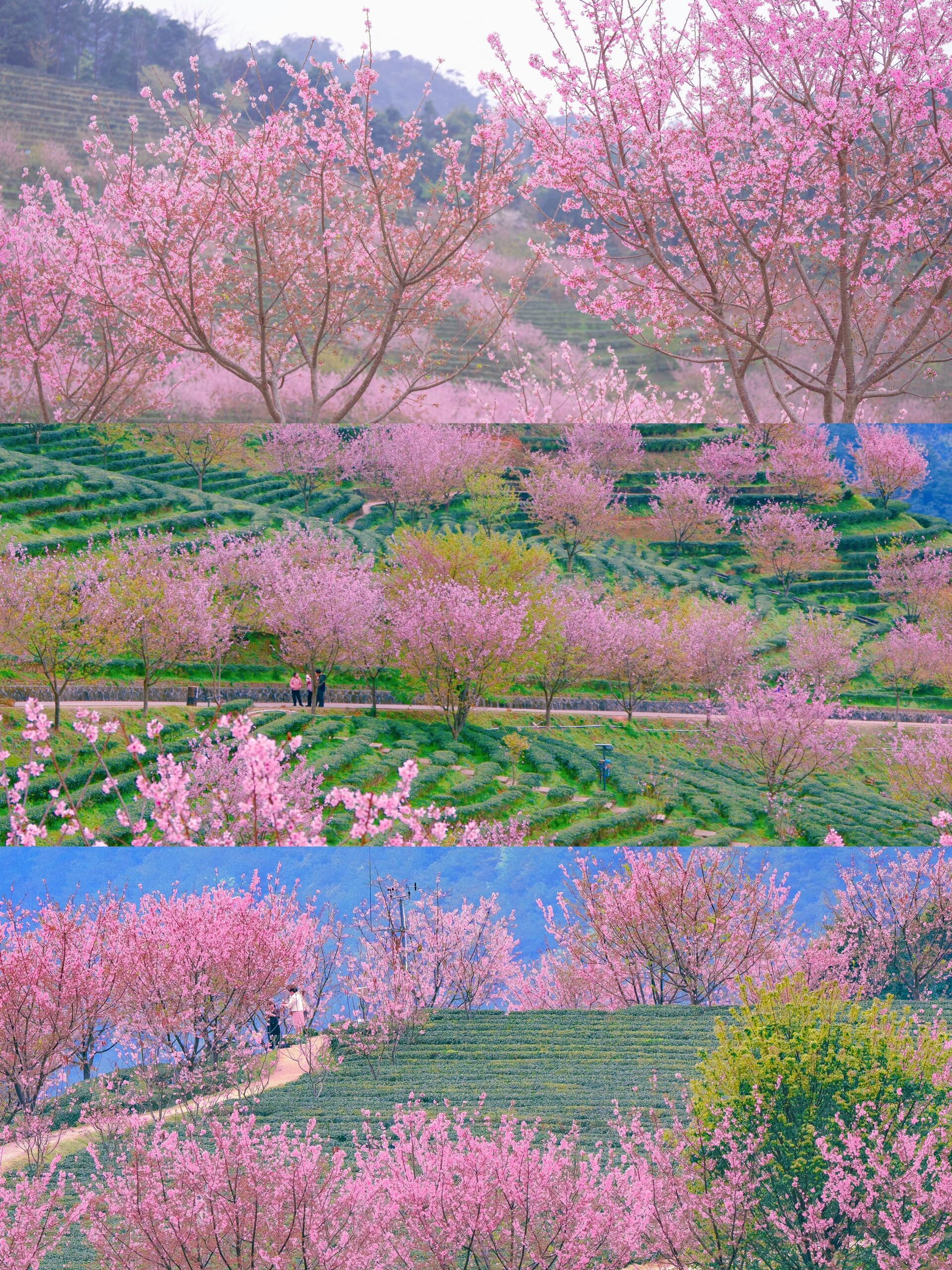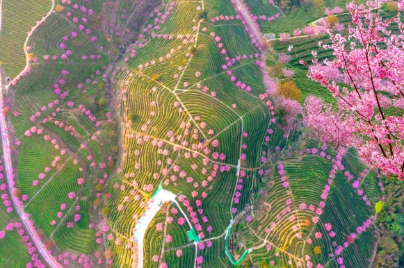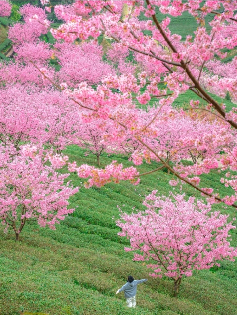 万株樱花在千亩茶田间恣意绽放