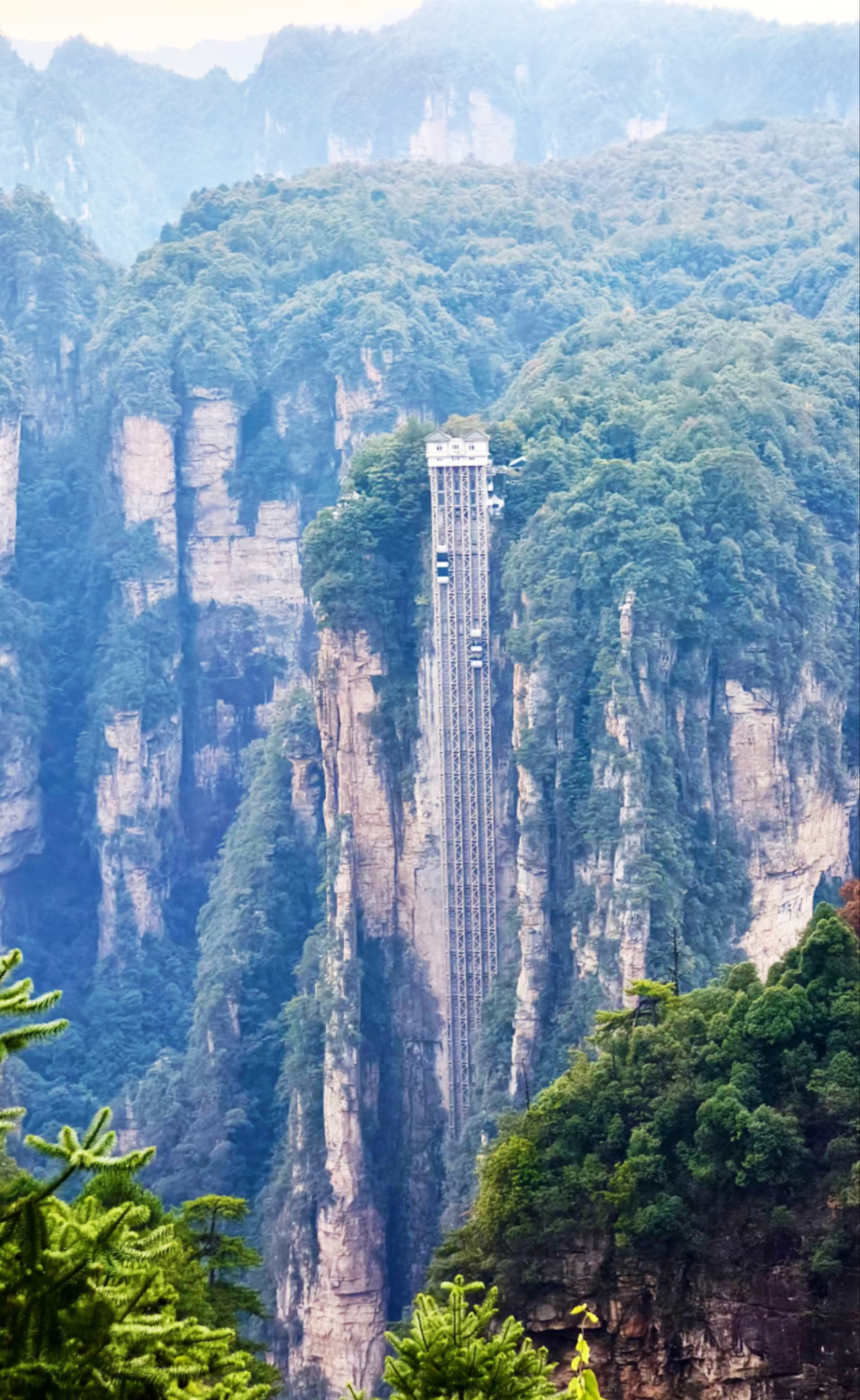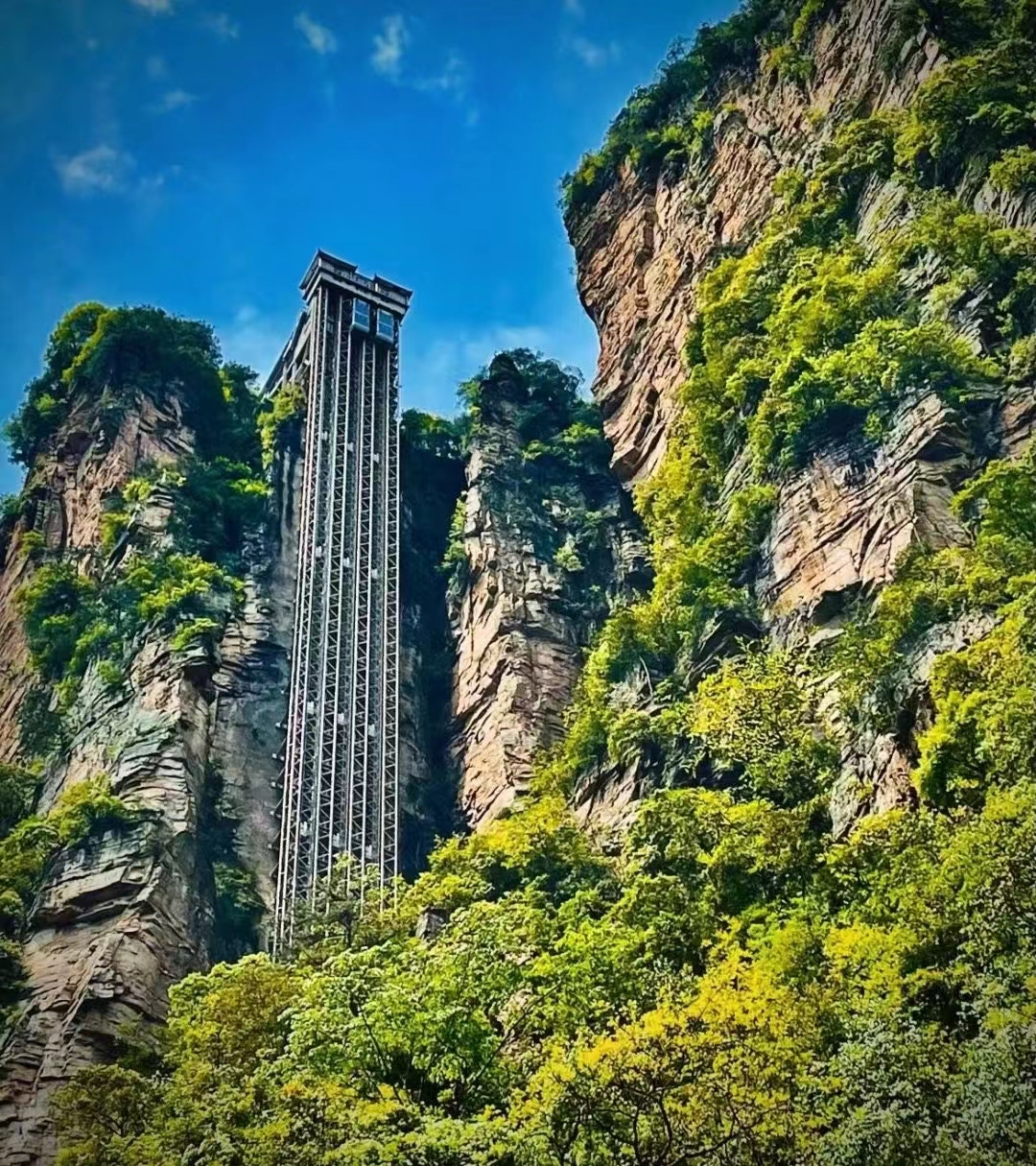 百龙天梯-世界最高户外电梯。垂直高差335米,三台并排观光电梯。