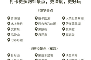 青海湖,茶卡盐湖,大柴旦翡翠湖,火星营地,翡翠湖,莫高窟,嘉峪关,七彩丹霞