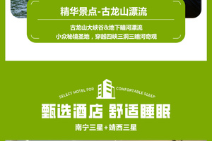 三个地下暗河溶洞及单级落差128米的古龙大瀑布和12个美如画卷的壮丽瀑布景观组成,全长7.8公里。有峡谷观光游(徒步)、地下河探秘漂、三峡二洞经典漂、三峡二洞自由漂、快乐激情漂等好玩项目。