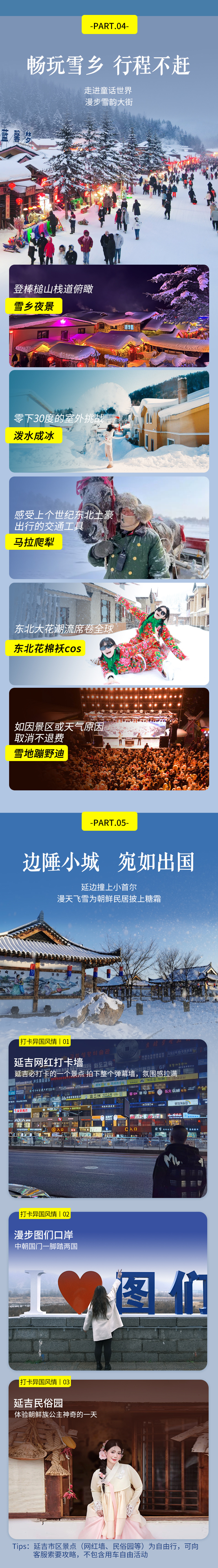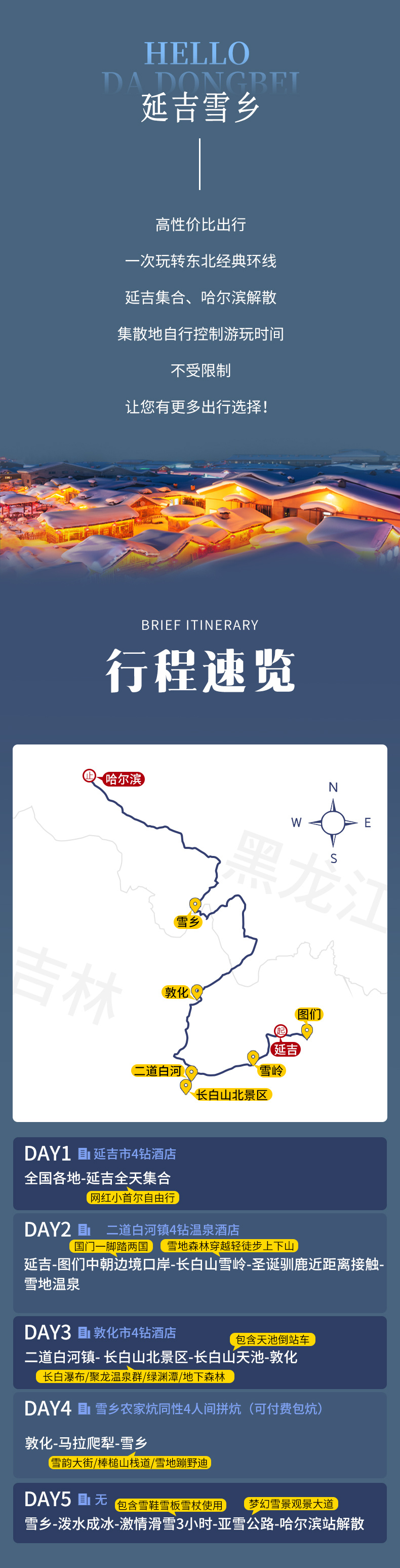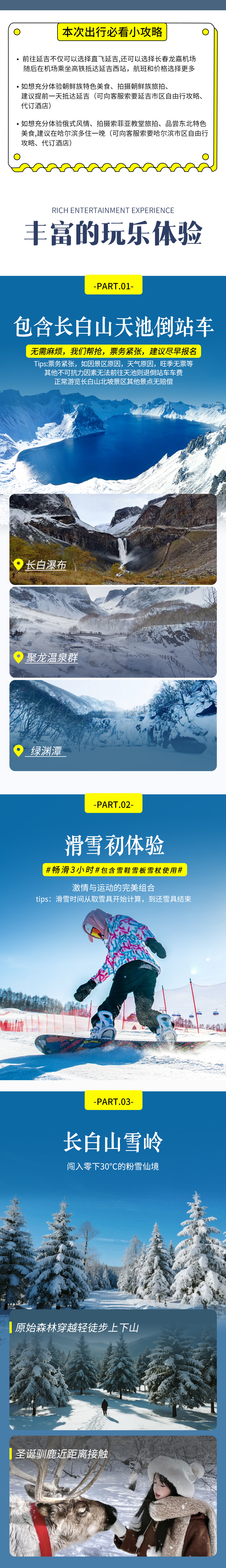 延吉-(50km,约1小时)图们中朝边境口岸-国门一脚踏两国-(180km,约3小时)长白山雪岭-森林雪山轻徒步-圣诞驯鹿接触-(65km,约1.5小时)雪地温泉