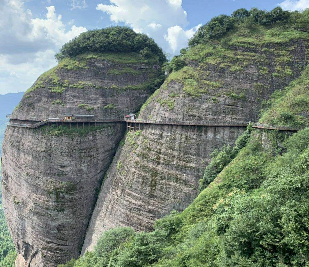 南武当玻璃栈道全长219多米悬挂在海拔600多米的岩石上,沿峭壁而建站在栈道往远方看去,栈道与山脉环抱
