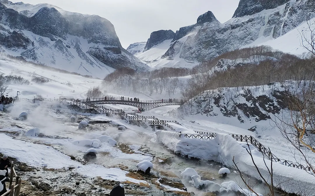 12:30 乘倒站车返回到中转服务站,换乘环保车赴【长白瀑布】,车程约10分钟,步行约20分钟到达长白冰雪瀑布底部近距离观看、摄影,参观【聚龙温泉群】,周围一片白雪,中间却热气腾腾,甚是美丽,游览30分钟,步行20分钟返回瀑布停车场。