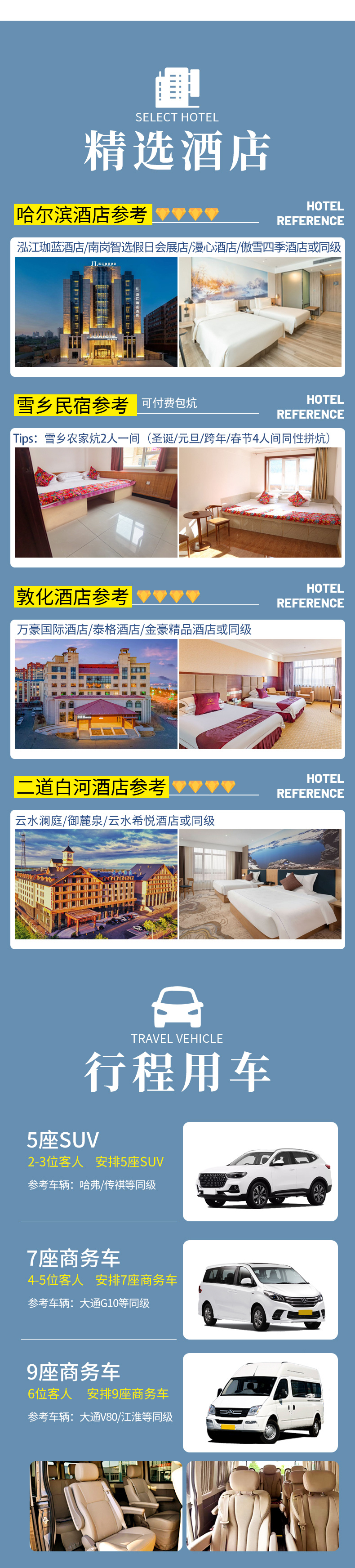 5、长白山由于冬季火爆限流前往,票务紧张,建议尽早报名好提前帮抢长白山天池倒站车票;如因景区原因、天气原因、旺季无票或者其他不可抗力因素无法前往则取消前往,退倒站车费用,其他景点正常游览无退费无赔偿。