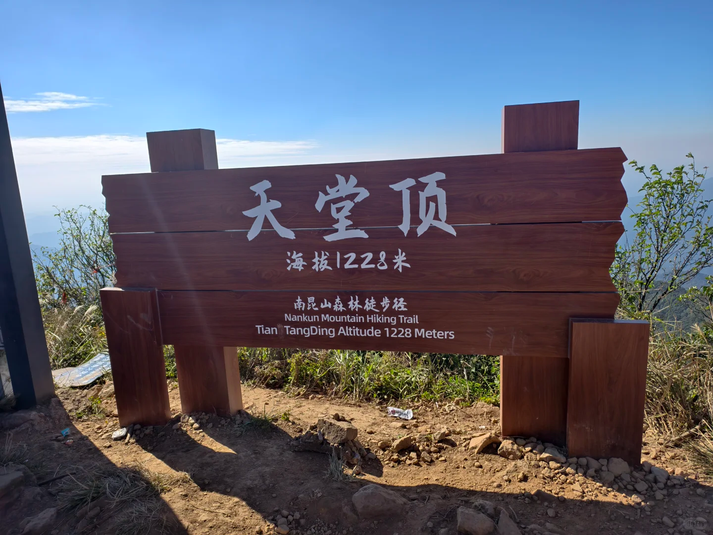10:30 开始徒步登山,高山漂流方向上山,到达广州第一峰石碑,进入登山径,此段路未经开发,为驴友走出来的原始小路,沿途需攀登斜坡,穿越草丛,务必穿长袖衣裤、遮阳帽、手套,建议带登山杖。