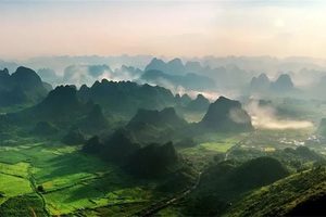 峰林之间分布着大片茶园,其淡雅的色调,韵味十足,茶树跟峰林相映,从茶园小道穿越而过,意境盎然。