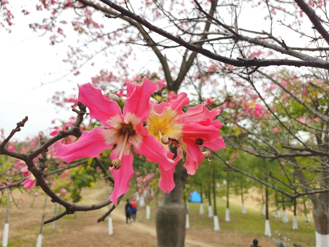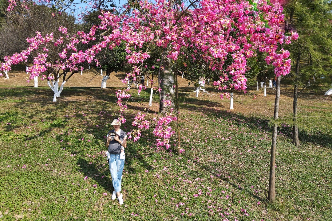 异木棉花开得正茂盛,落羽杉又怎会“无动于衷”呢?