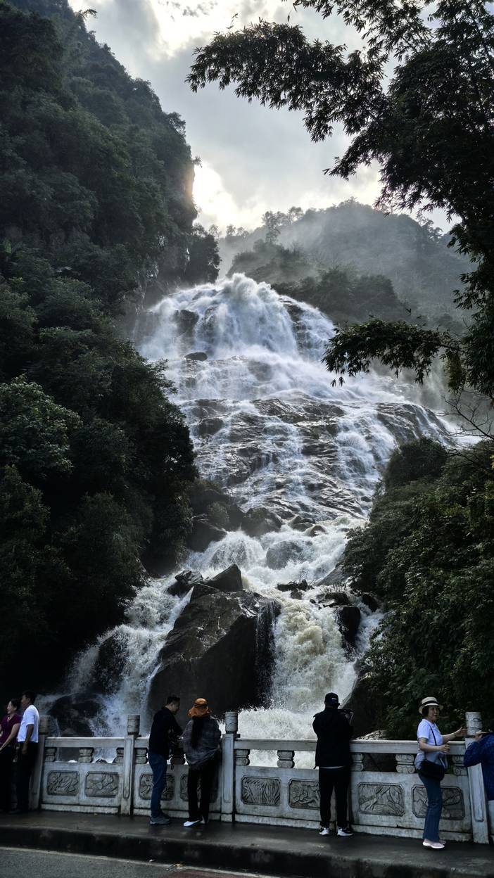 午餐后,我们开始上哀牢山,途中山路九曲十八弯,一个突然的大转弯后,我们来到【南恩瀑布】。“南恩”在傣语中,指银白色的水流。银色的水花、陡峻的山崖,一眼望不到顶的瀑布,何其壮观。面对南恩瀑布时,会忍不住感叹“飞流直下三千尺,疑是银河落九天”的“写实”。