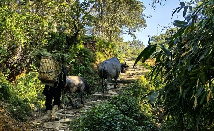 徒步走进梯田之间,脚下的田埂狭窄而陡峭,每一步都需小心翼翼。沿途中,哈尼族人民,或弯腰赶鸭牧牛,或挥汗如雨地耕作,一千多年过去了,哈尼族人民仍然对这片土地如此的热爱与执着。