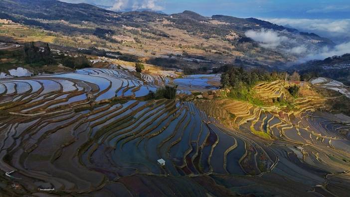 伙伴们早早起床,去看最出名的【元阳梯田日出】。天际渐渐由深蓝转为浅紫,再慢慢过渡到绚烂的金黄,那一刻,时间仿佛凝固了。梯田中的水面如同无数面镜子,静静地捕捉着这变幻莫测的天空,将每一缕光线、每一抹色彩都完美地倒映其中。