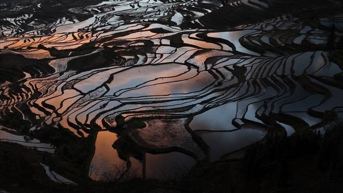 之后便是看【元阳梯田日落】的最佳时间哦!当夕阳缓缓西沉,金色的阳光斜洒在层层叠叠的梯田之上,每一块田地都像是被精心镶嵌的金色鳞片,闪耀着温暖而耀眼的光芒。