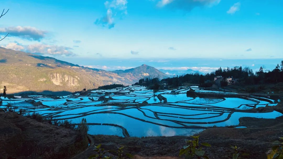 之后,前往观看【爱春蓝梯田】,当晨光穿透云层,万亩梯田瞬间幻作蔚蓝镜面,天水一色,光影如诗,伙伴们按下快门,捕捉梯田与蓝天交错的绝美倒影。