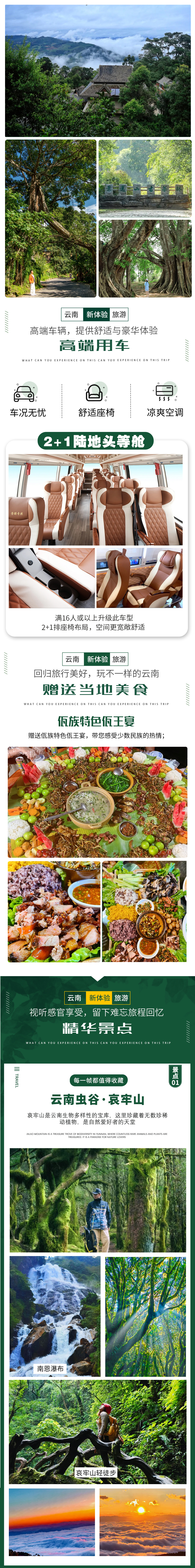 2. 【景点及门票】:哀牢山套票(金山原始森林+石门峡),南恩瀑布,无量山樱花谷门票,司岗里,国画长廊,葫芦小镇,沧源崖画门票,永和口岸,翁丁村门票,佤族班鸽村及电瓶车,娜允古镇,博航老寨,勐梭龙潭,龙摩爷门票,景迈山,糯干古寨,翁基千年古寨,景真八角亭门票;