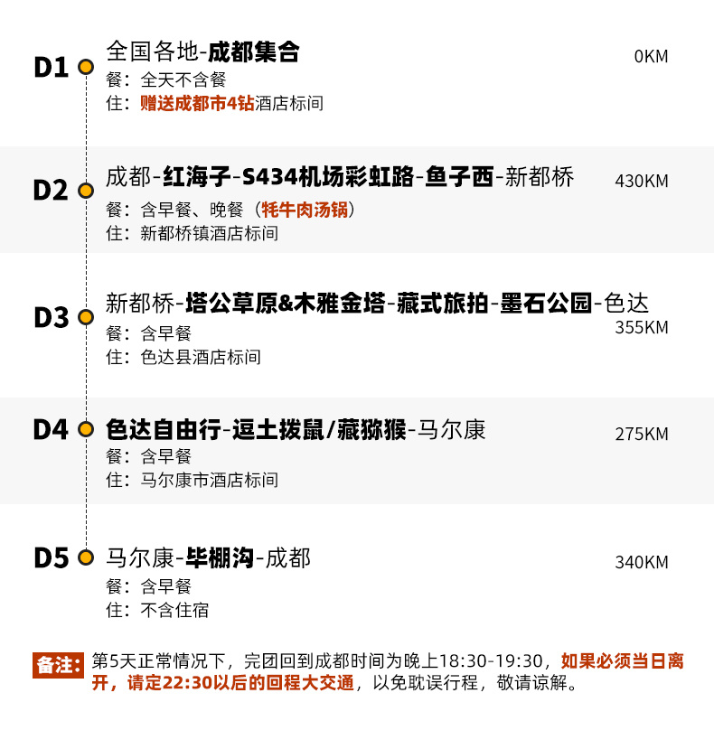 4、景交:毕棚沟观光车70元/人(必须)+电瓶车20-30元/人(分段计费、可选),墨石公园观光车20元/人(必须);红海子清洁费30元/人(可选);鱼子西清洁费30元/人(必须);色达乘车票48元/人,报名后请根据自己的游玩日期自行预约;
