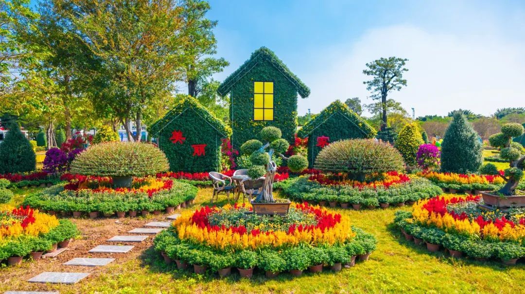 亮点三 荷兰风车花园用菊艺扎作出风车、木鞋、花田;法国画廊花园用菊花搭建地标性建筑物凯旋门;德国啤酒花园以黄菊动态呈现流动的啤酒;英国巴士花园模拟打造双层复古巴士、电话亭、伦敦桥场景。