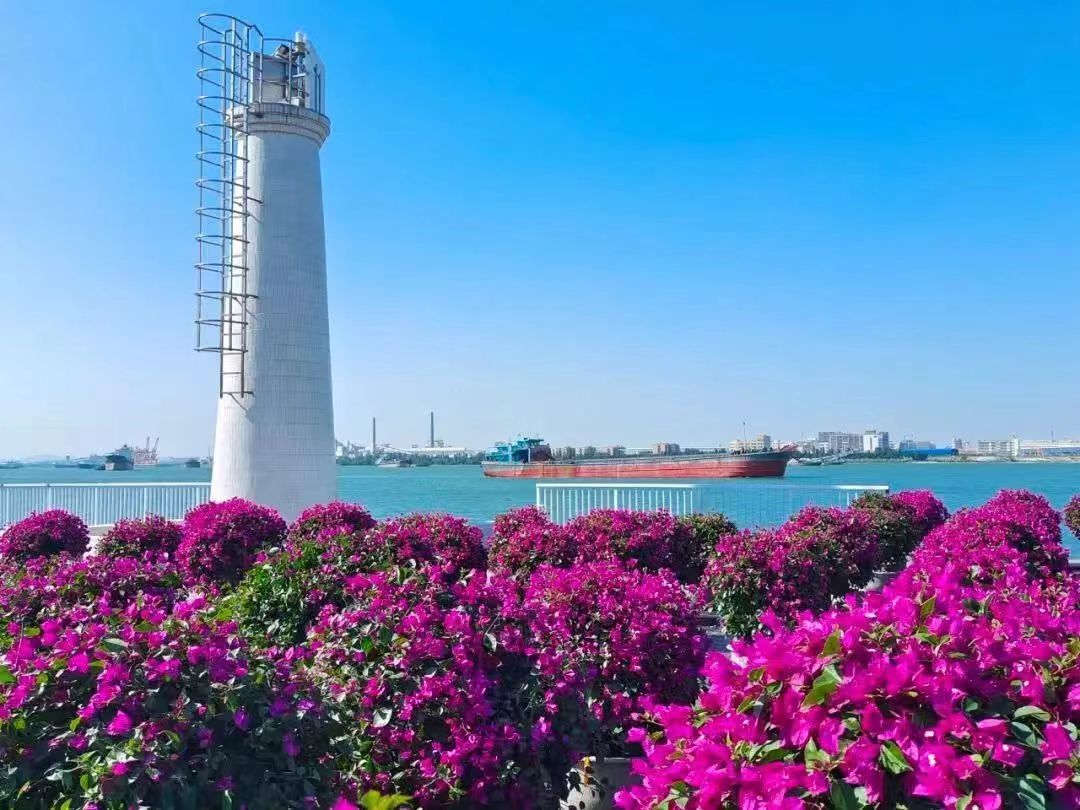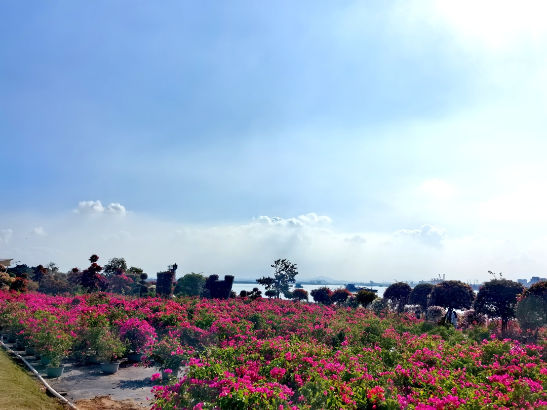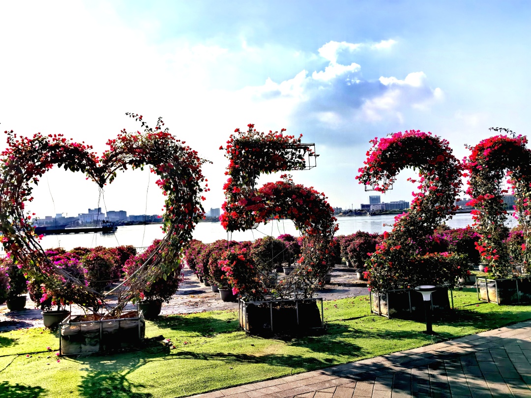 亮点二 1400平方米深中通道主题大型造景,通过模拟深中通道的深中大桥和西人工岛,配合蓝紫色花境模拟的海水波涛以及绚丽夺目烟花灯饰,赞颂这一意义非凡的世界级跨海集群工程。