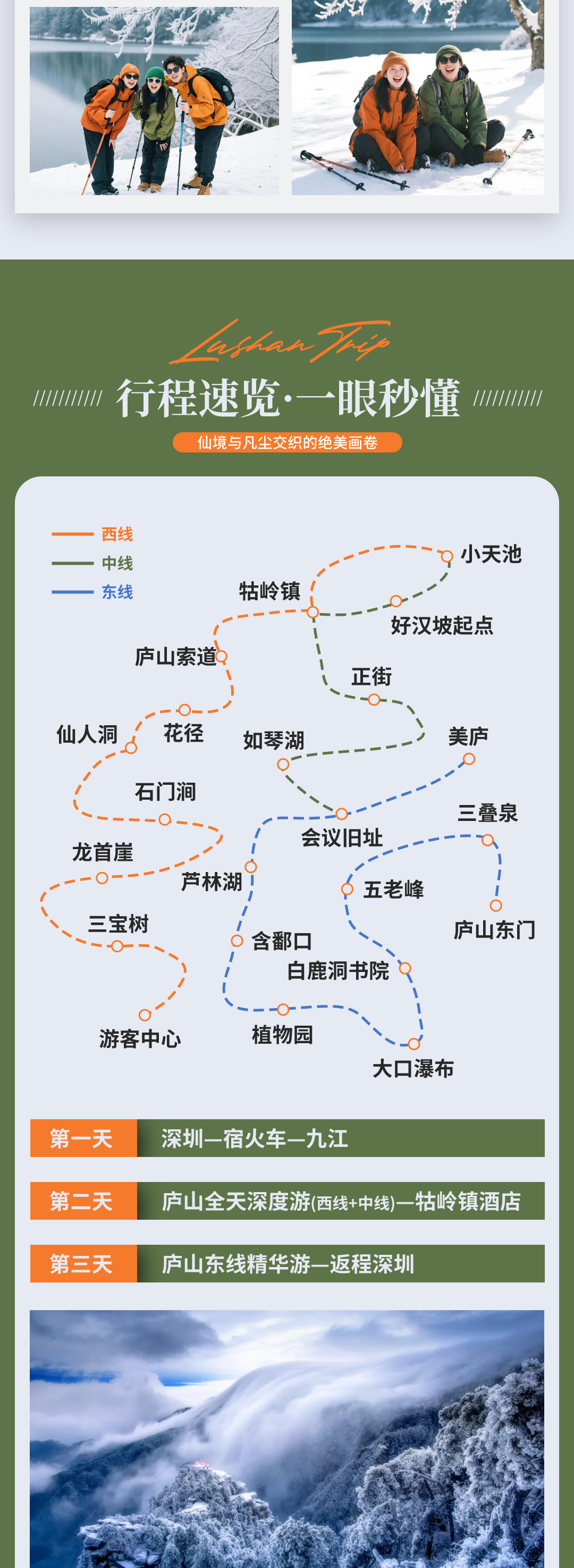 11:00前回到牯岭镇,取行李后乘索道下山(已包含),集合人齐前往九江站,结束本次的冰雪云海之旅。