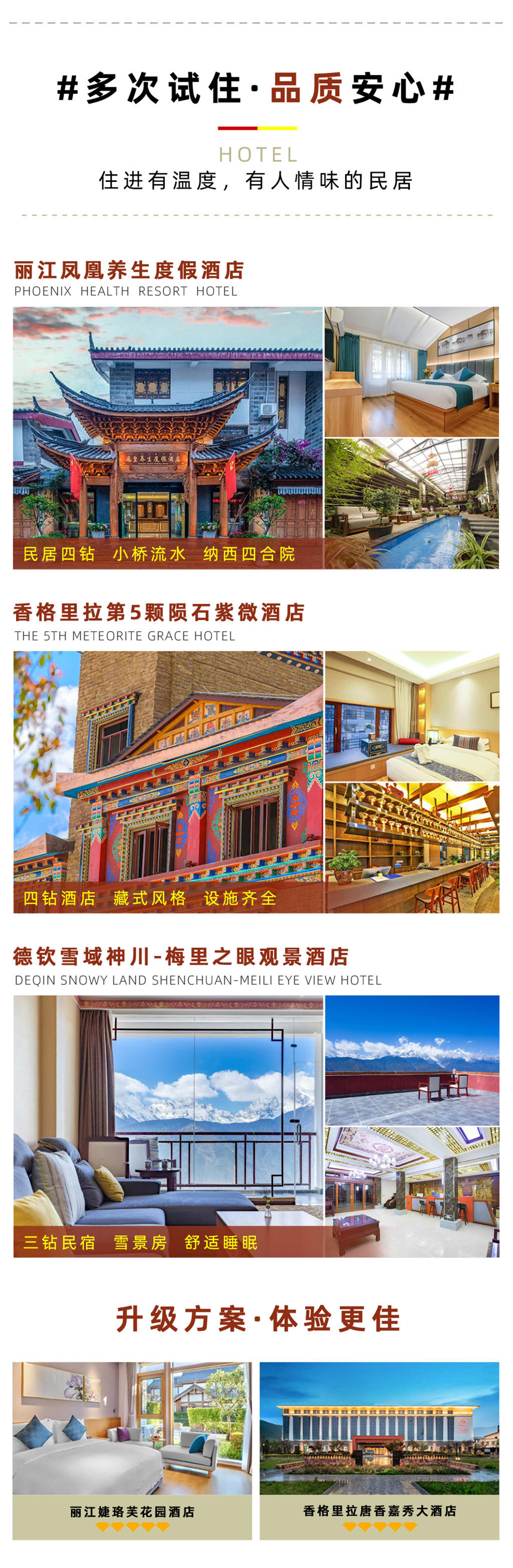 丽江4钻酒店:丽江古城宜尚PULS酒店/丽江藏元雪山揽景酒店/丽江凤皇养生度假酒店/丽江古城天香格酒/丽江金悦源酒店/丽江古城艾泽拉斯轻奢客栈或其他同级酒店。