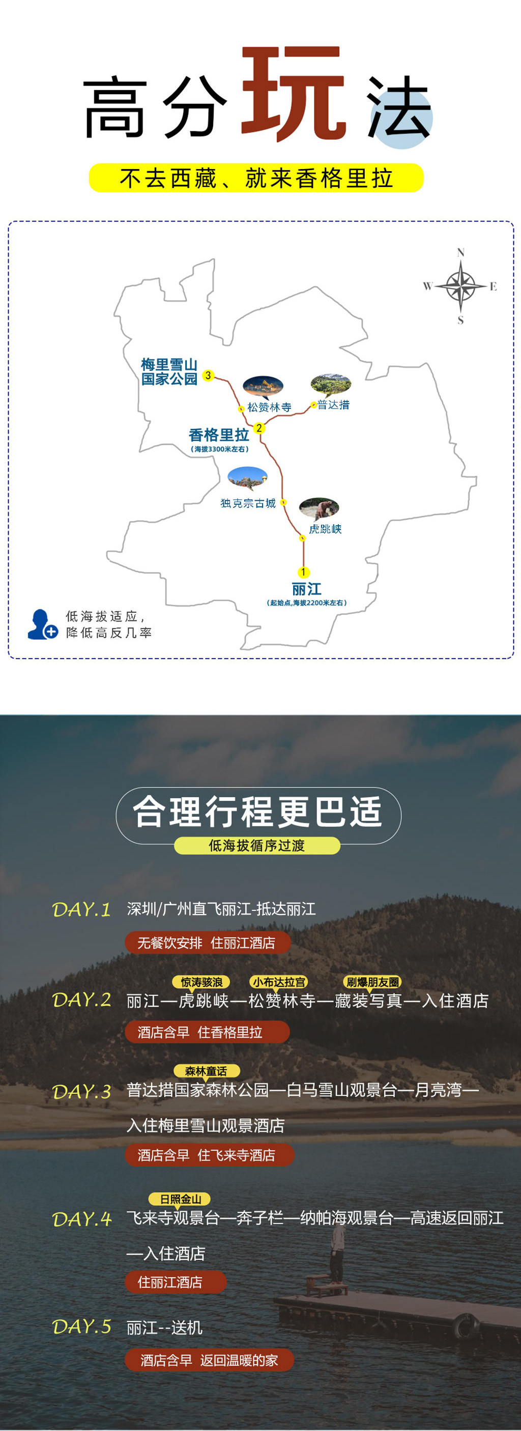 1、海拔数据:香格里拉市海拔约3300米 ;金沙江边海拔约1800米 ; 白马雪山最高处4292米 ;飞来寺观景台海拔约3600米。今日行程中海拔处于高低起伏状态,请前一晚注意休息,保持良好心态。