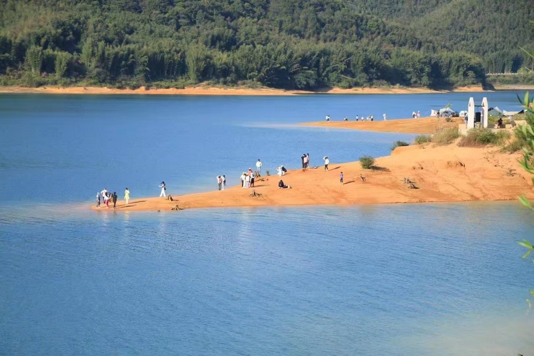 这里的湖水清澈见底,远远望去,宛如一块碧玉,配上几分宁静小杉村,宛如一幅画卷。