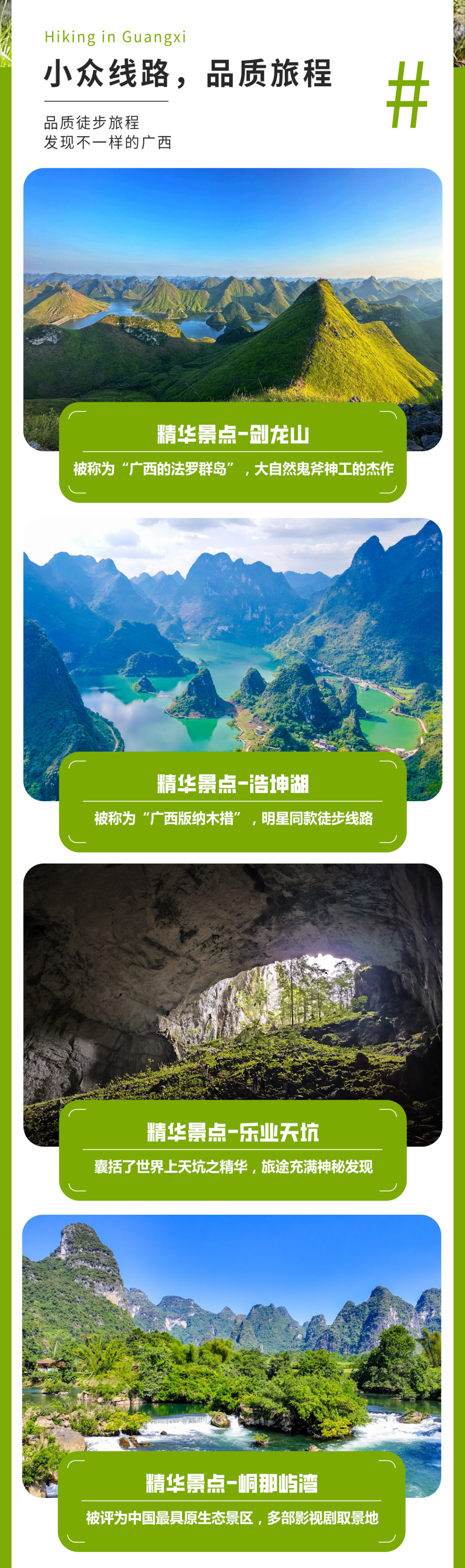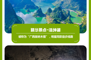 08:00早餐后出发,坐车1小时到达浩坤湖徒步起点,今天徒步网红浩坤湖穿越线,全程约13公里,爬升500米,徒步6小时左右。中午也是路餐干粮。这里也是广西山水经典的徒步景色