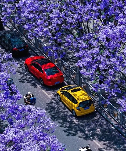 下午我们前往打卡【昆明校场中路蓝花楹】,如果说富民上河院是古风摄影的私藏秘境,那么教场中路就是那片必须亲临的、人潮涌动的紫色海洋。道路两侧的蓝花楹树冠在空中交汇,形成一条长约1.4公里的天然拱廊。花开最盛时(通常在五一前后),抬头是花瀑,低头是花毯,空气都是紫色的。特意带领大家乘坐双层蓝花楹环线观光巴士拍照打卡,品尝蓝花楹文创雪糕。