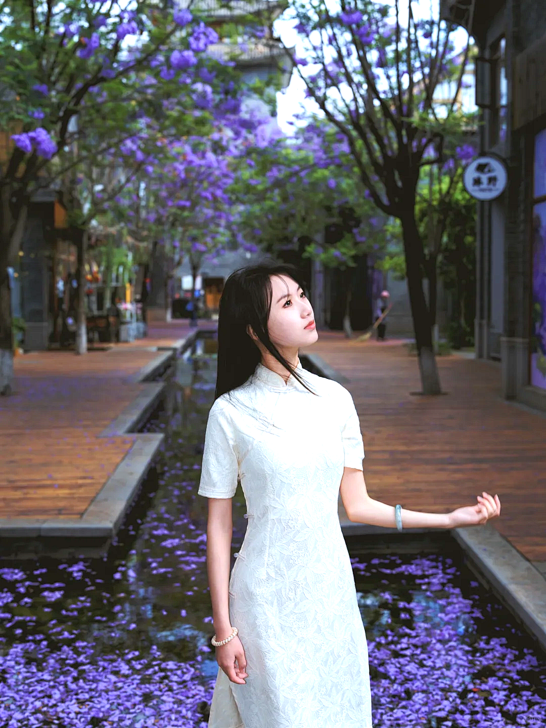 之后我们途径【富民上河院】,它是“新中式”与“蓝花楹”结合的网红打卡地。当蓝花楹盛开时,蓝紫色的花朵与古朴的中式建筑形成强烈的色彩碰撞。站在碉楼前、水池边,仿佛穿越到了一个紫色的古代梦境。