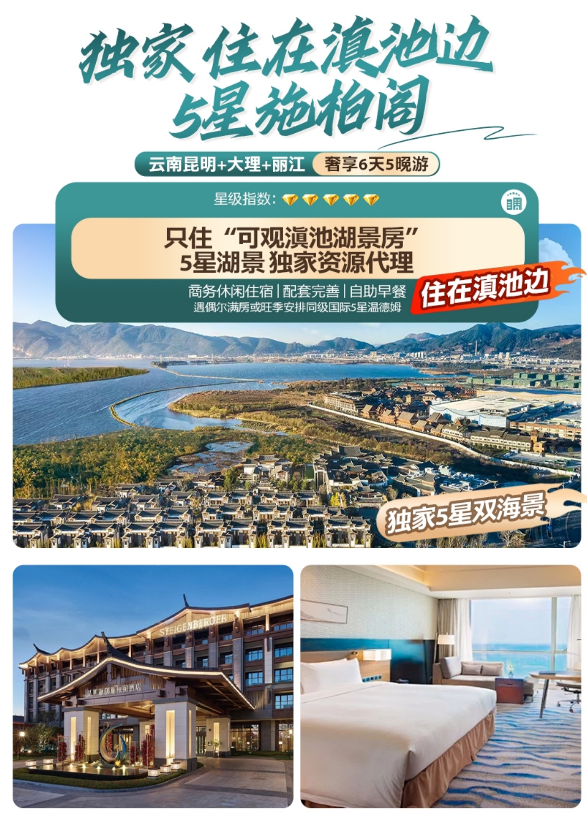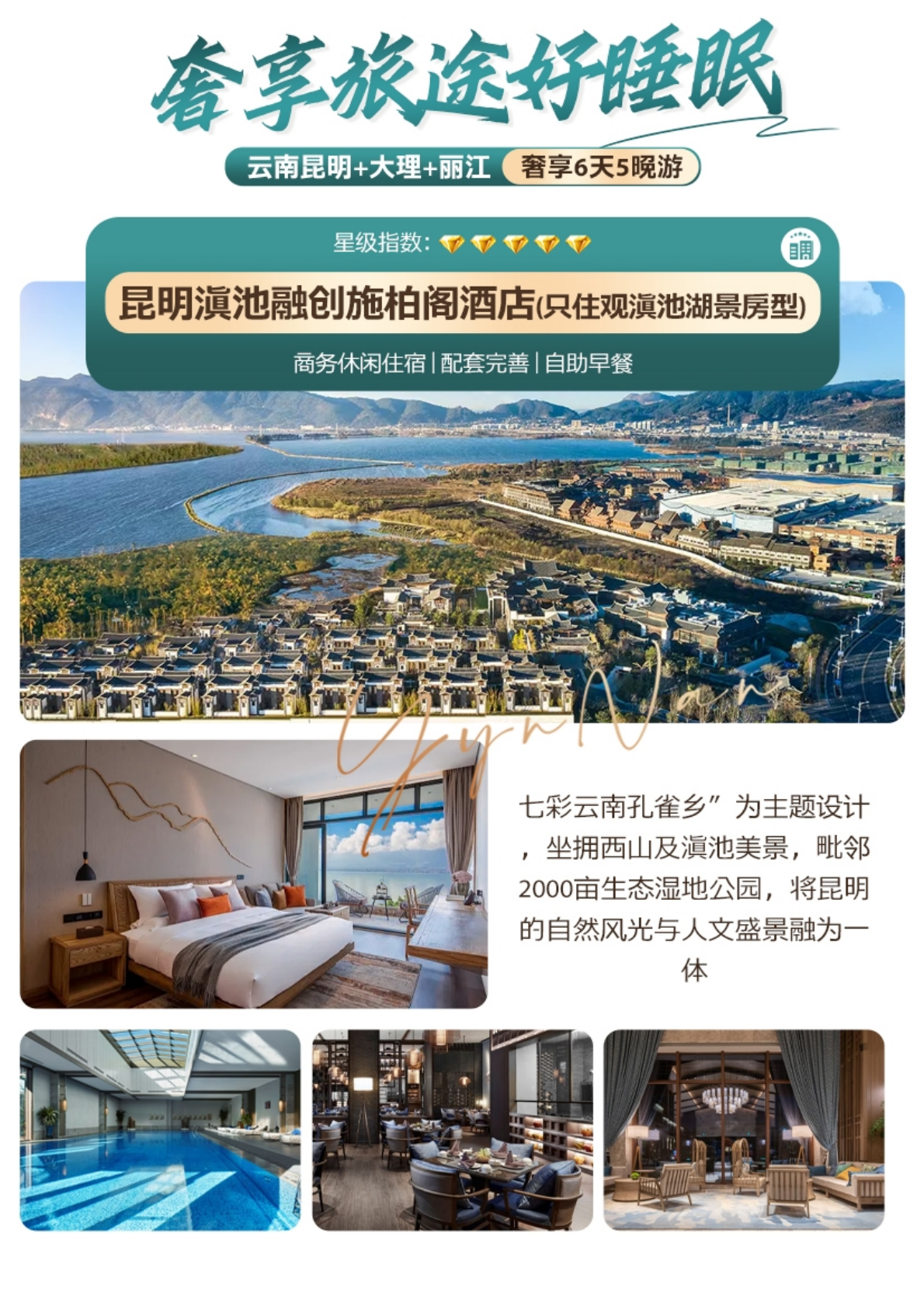 住宿:昆明滇池融创施柏阁酒店;(如遇政府征用施柏阁酒店或特殊情况满房,调整酒店顺序安排第一晚住昆明5钻、最后一晚住5钻施柏阁湖景房)
