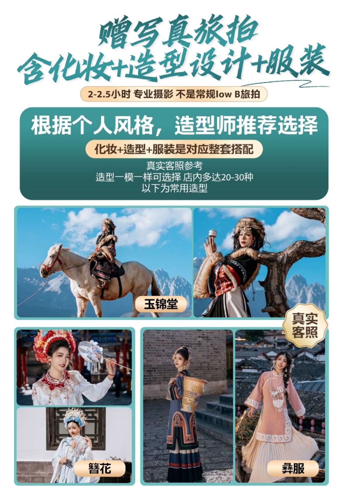 前往丽江古城内进行【个人写真旅拍】或去看 【丽江千古情】2选1,(看千古情的需报名提前确认 否则默认安排专业写真)(每人赠送5张专业级精修照片,底片20张/每人),由我们的专业造型师、化妆师、服装师一对一进行素人改造后,再跟随专业摄影师到丽江古城内指定网红取景点进行专业拍摄属于您的个人写真大片。用写真照亮您的旅程!留住不一样的!让您与众不同玩转朋友圈,尽情分享不一样的旅途+不一样的您!(项目不用不退)