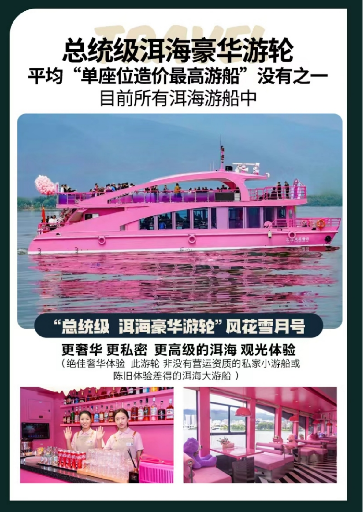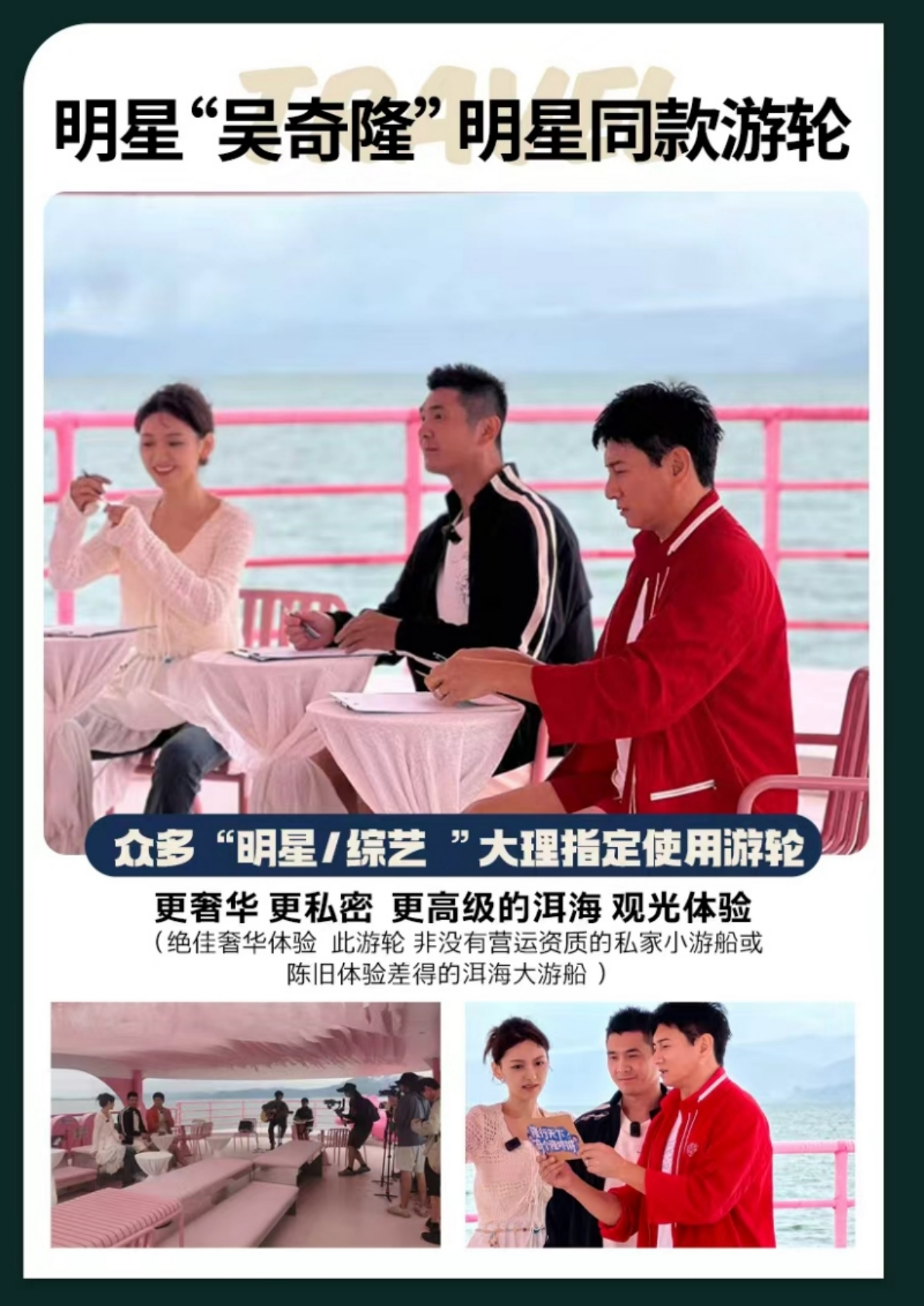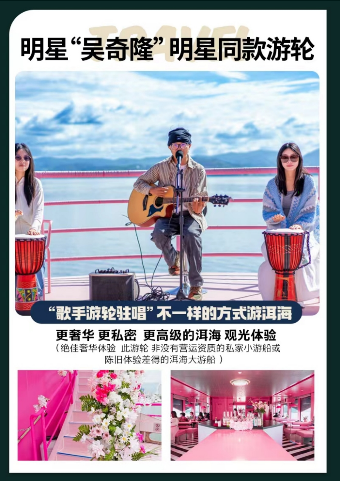 后乘车前往前往大理【总统级豪华游轮奢华游洱海】”吴奇隆明星同款“ 众多明星 综艺大理拍摄指定用船,1小时游轮洱海游览,体验非一般的 更奢华 更私密 更高级的洱海观光体验,远观苍山,绝佳奢华洱海游轮游览体验 (此游轮官方售价228元/人票价,非没有营运资质的私家小游艇或陈旧体验差得的洱海大游船 成本较高 体验更加)