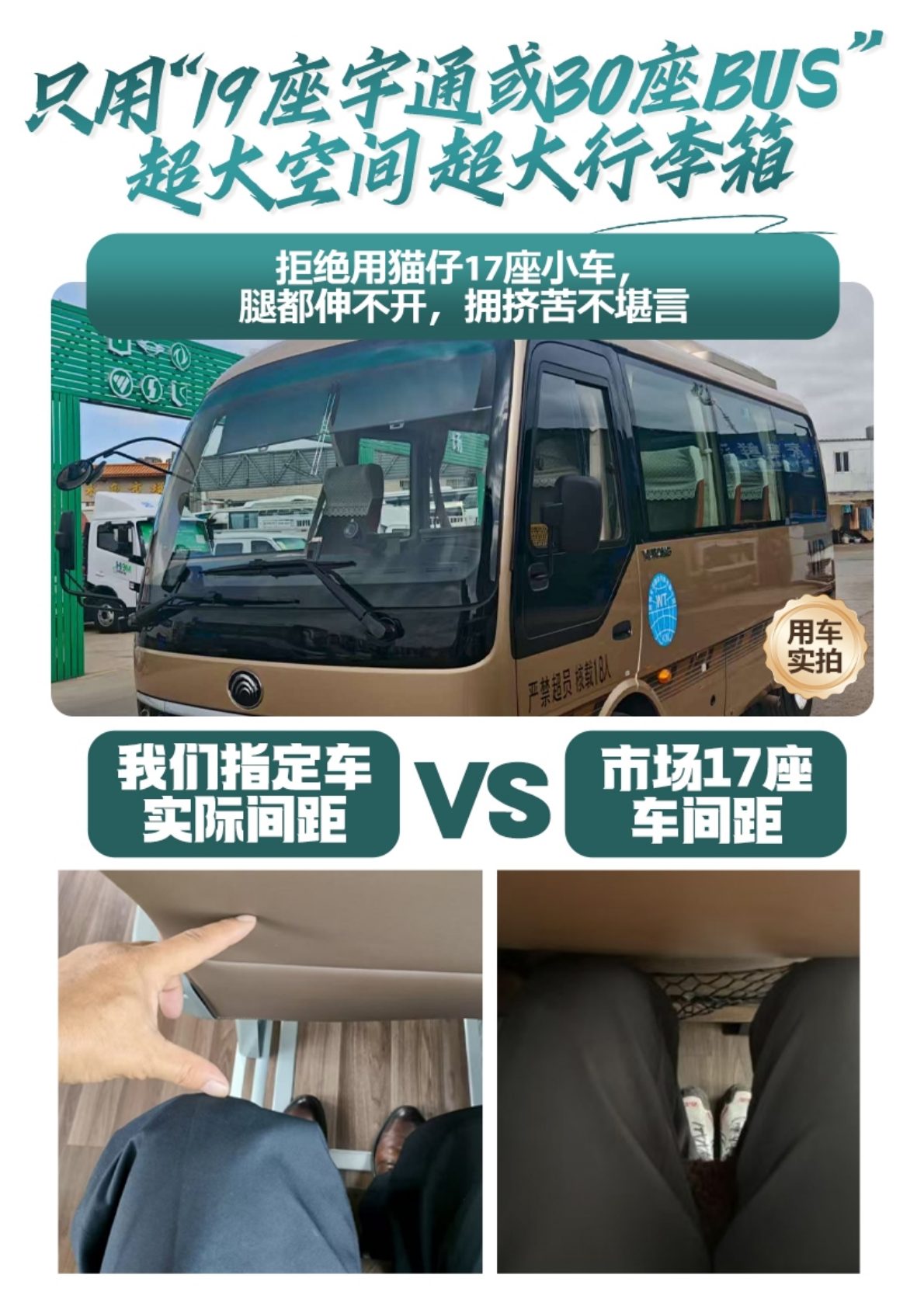 用车:3年内空调旅游大巴,5年以上专业司机驾驶,确保一人一座;