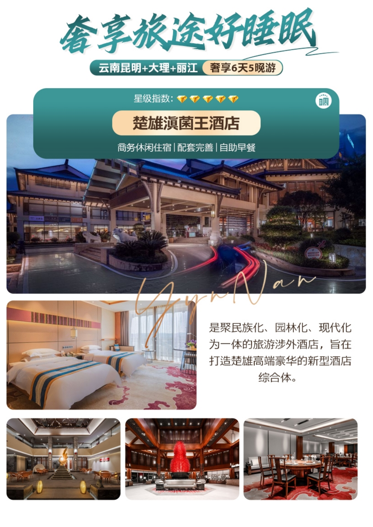 酒店参考:滇菌王希丽酒店、海悦文华温德姆花园酒店、云南琢舍酒店或同级;