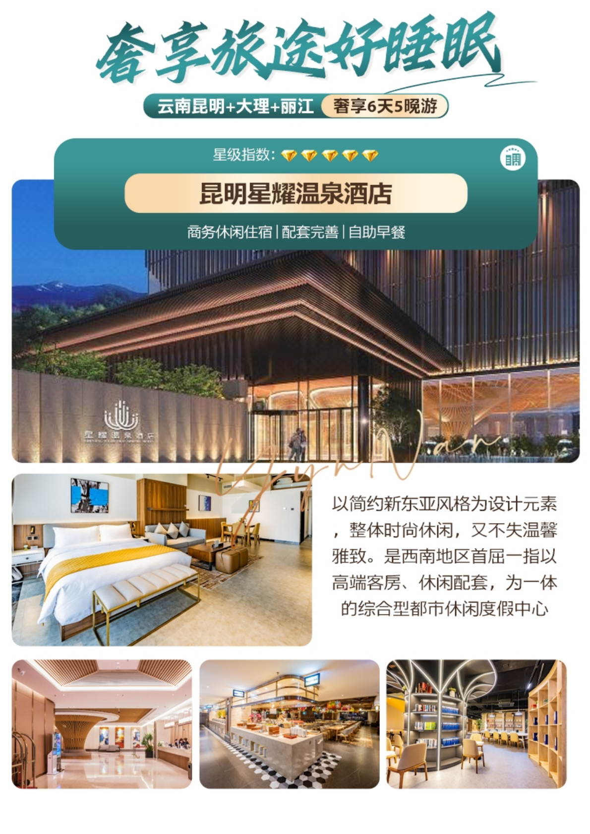 酒店参考:昆明5钻酒店:星耀酒店、银园酒店、丽水云泉酒店或同级;