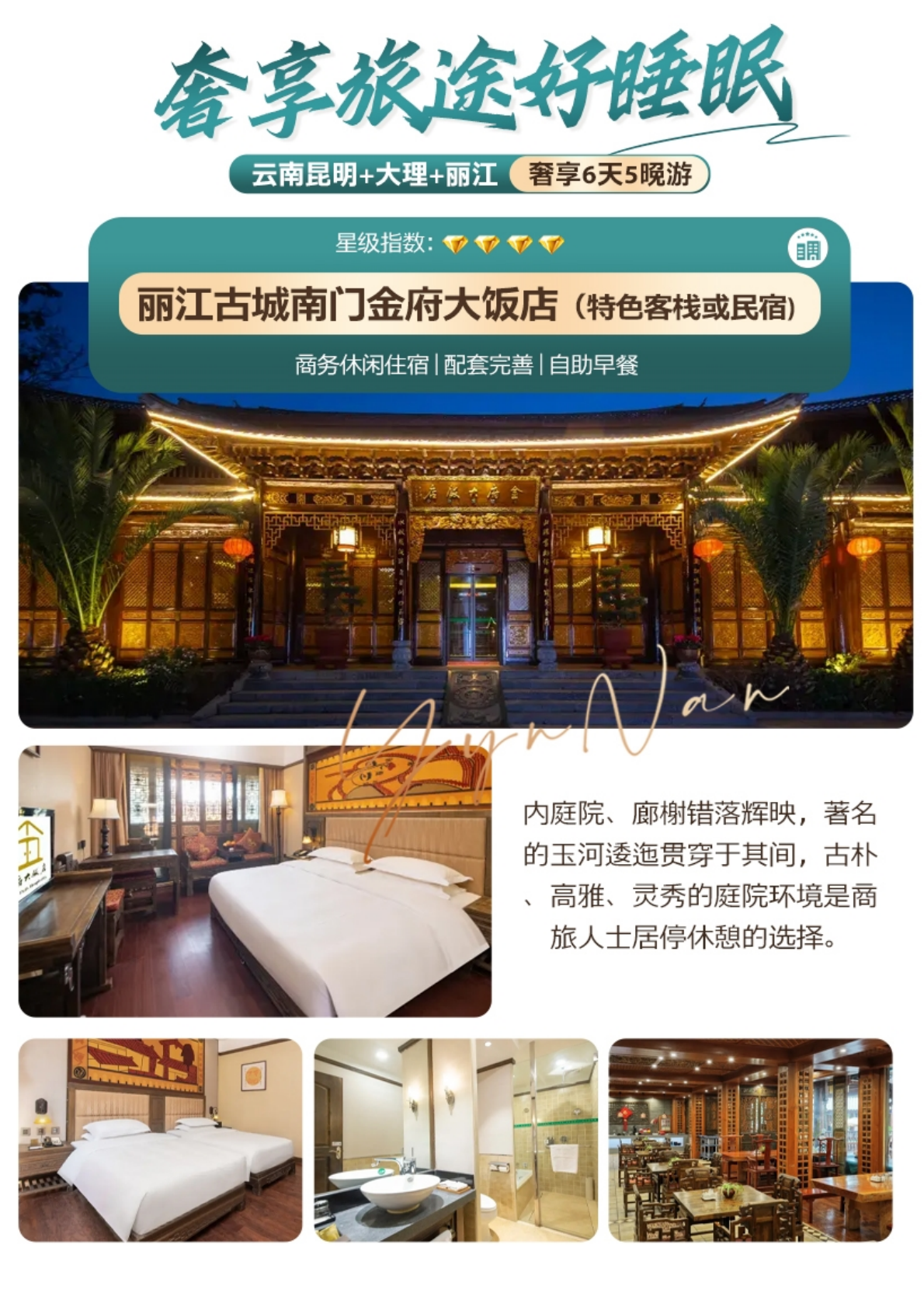 酒店参考:丽江4钻客栈酒店:滇菌王(古城店)、金悦源酒店、古城天香阁客栈、古城金府客栈、博苑客栈、茹心禅院客栈或者同级