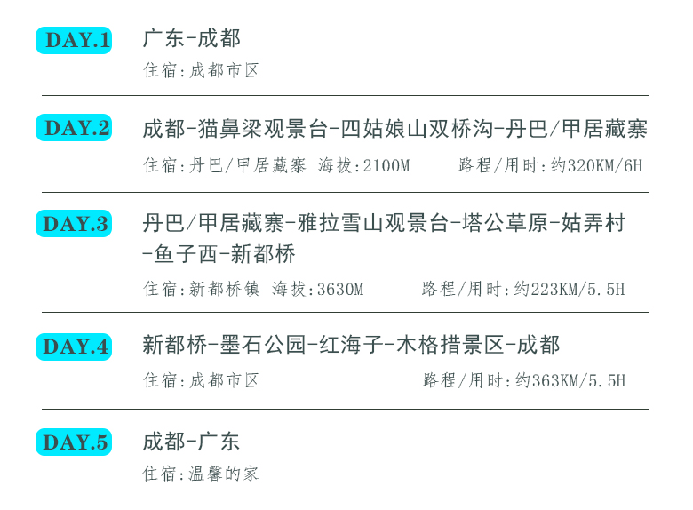 2、如鱼子西和格底拉姆无法前往,替换为八郎生都村、扎真、新都桥观景台等同类型观景点,如产生相关景点中转车、清洁费等费用,需自理。