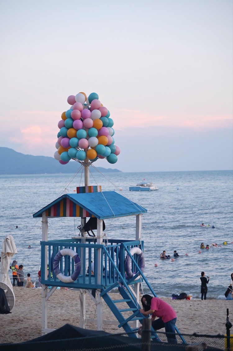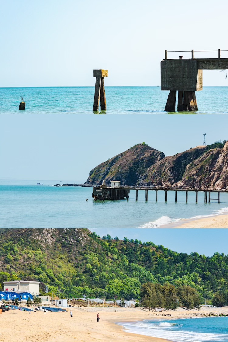 从高处俯瞰,青澳湾犹如一轮弯弯的新月。金黄柔软的沙湾绵延2400米,一直延伸到水下几百米之外。