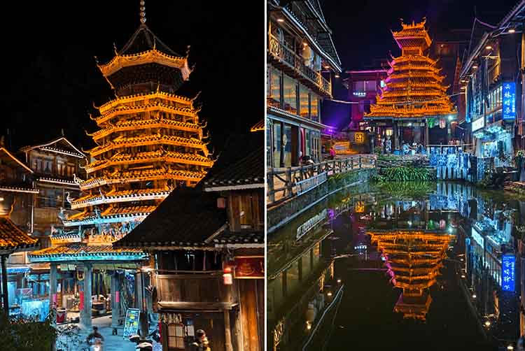 晚间登上观景台欣赏侗寨夜色全景,在鼓楼下聆听侗族大歌或寻一小馆,邂逅欢乐的旅程。亦可自行购票观看侗族歌舞或篝火晚会商业演出等。