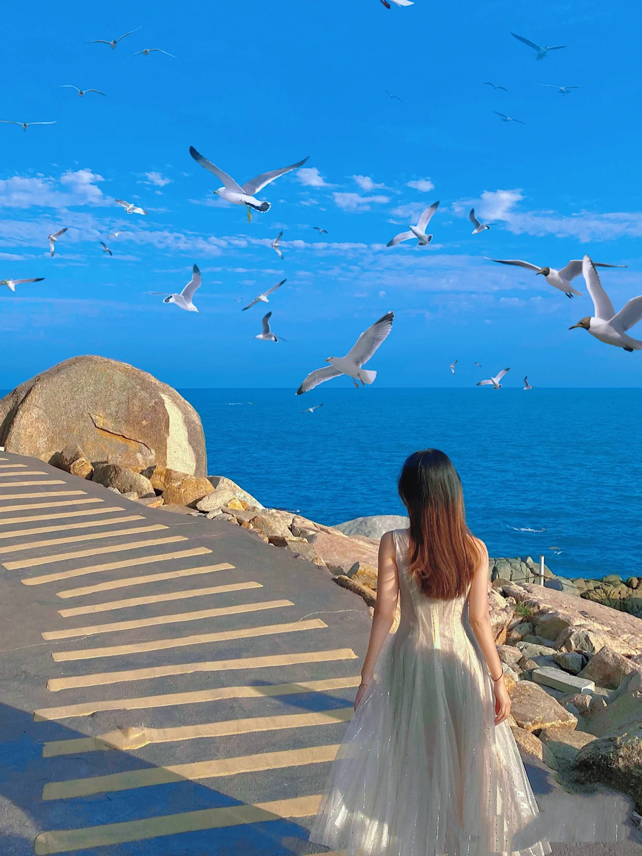 14:15 前往【礁石公园】(海边摄影基地)拍照,礁石公园拍美照,里面有各种摄影摆件,如热气球、白钢琴等等,刷爆朋友圈(里面的摆件是会定期更新或者置换)。