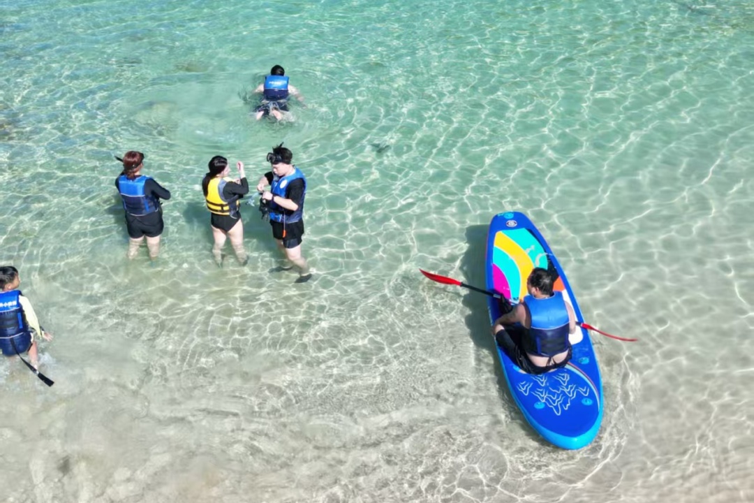 14:30 领取浮潜和桨板工具,讲解水上活动的体验要领、注意事项,分批开始体验(提醒:下水必须全程穿好救生衣)
