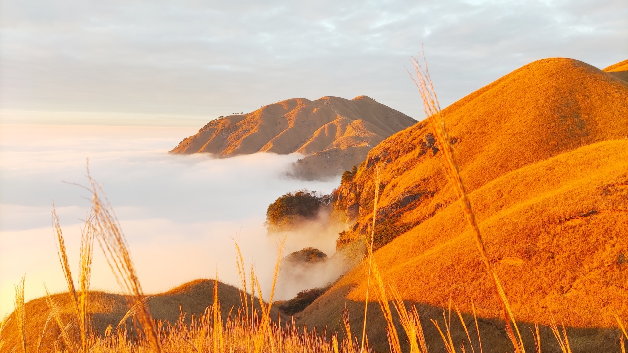 绿色的草甸转变成了一片金黄,一眼望去,大地披上了盛装,云遮雾绕之时,这草更增添了迷人的魅力。