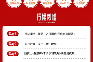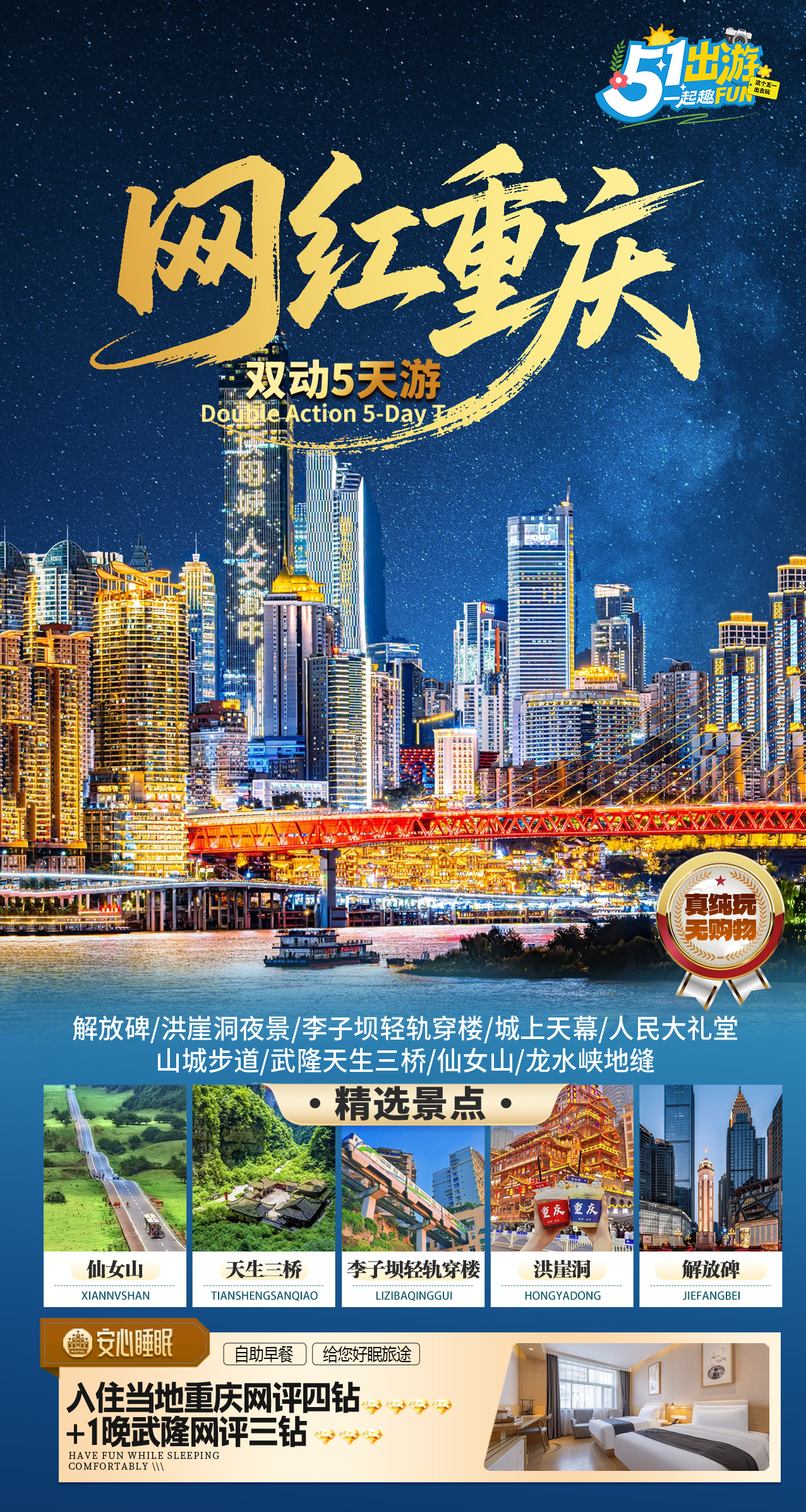 住宿:3晚重庆网评四钻+1晚武隆网评3钻酒店