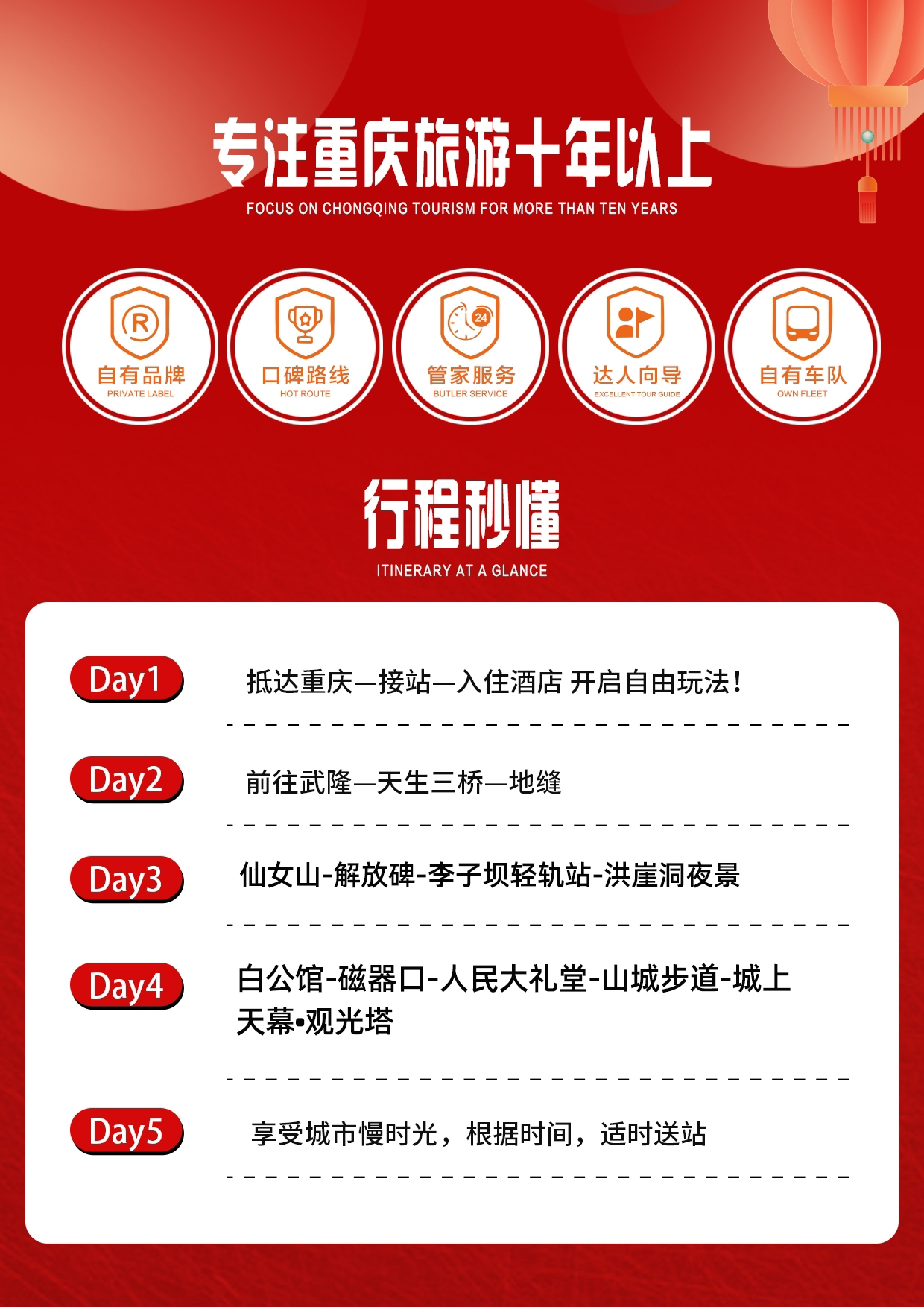 ★品质奢享:纯玩0购物 ★尊享住宿:甄选4晚舒适酒店,保障睡眠质量 ★温馨服务:24小时管家服务,让游客更放心! ★深度游览精华景点一网打尽 【武隆天生三桥】【武隆仙女山】【龙水峡地缝】 【磁器口古镇】【解放碑】【洪崖洞夜景游】【李子坝轻轨穿楼】【云上天幕】