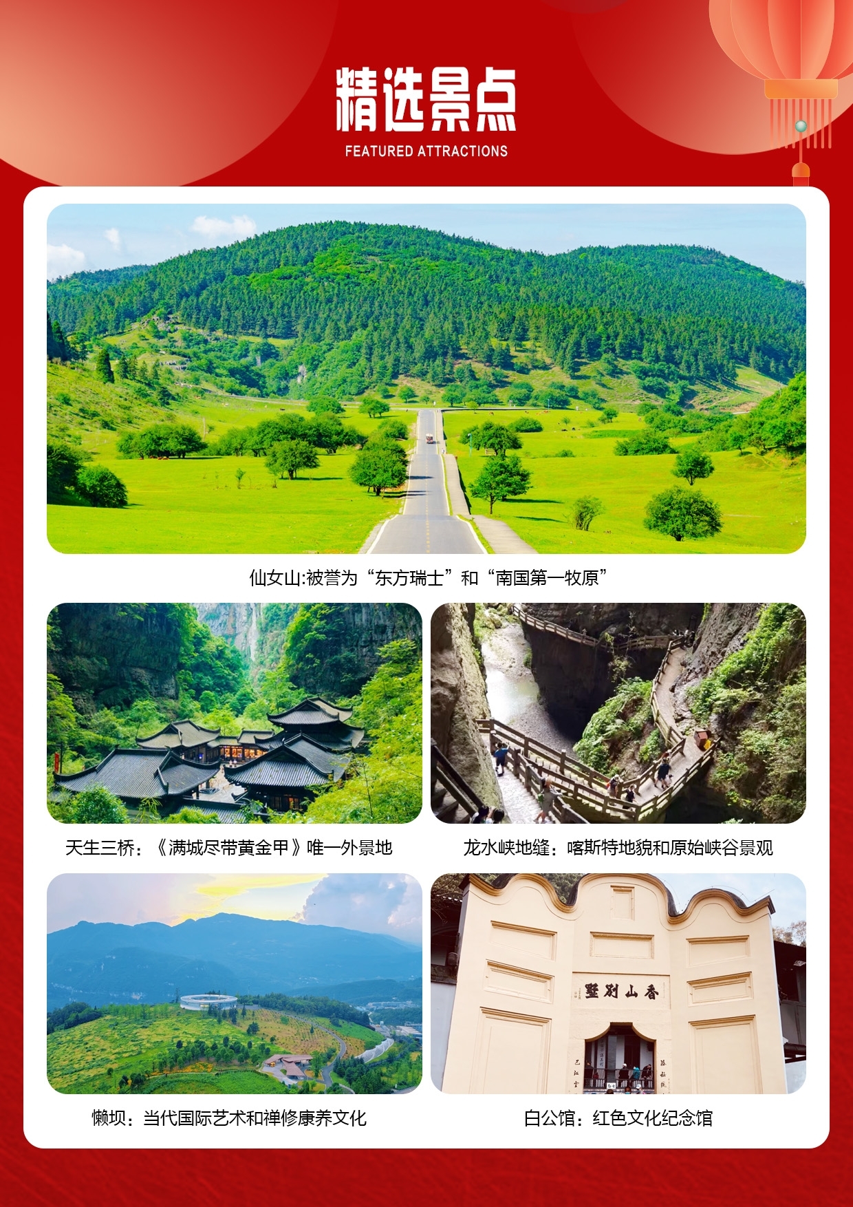 酒店早餐后乘车前往国家AAAAA级风景区【仙女山国家森林公园】(游览时间不低于60分钟)仙女山平均海拔1900米,以其独具魅力的高山草原被誉为“东方瑞士”和“南国第一牧原”,其旖旎美艳的森林草原风光在重庆独树一帜。抬头便可见蔚蓝天空与朵朵白云,走进33万亩森林和十万亩草场形成的巨型“氧吧”,感受渗进皮肤的丝丝凉意与沁人心脾的草原清新。