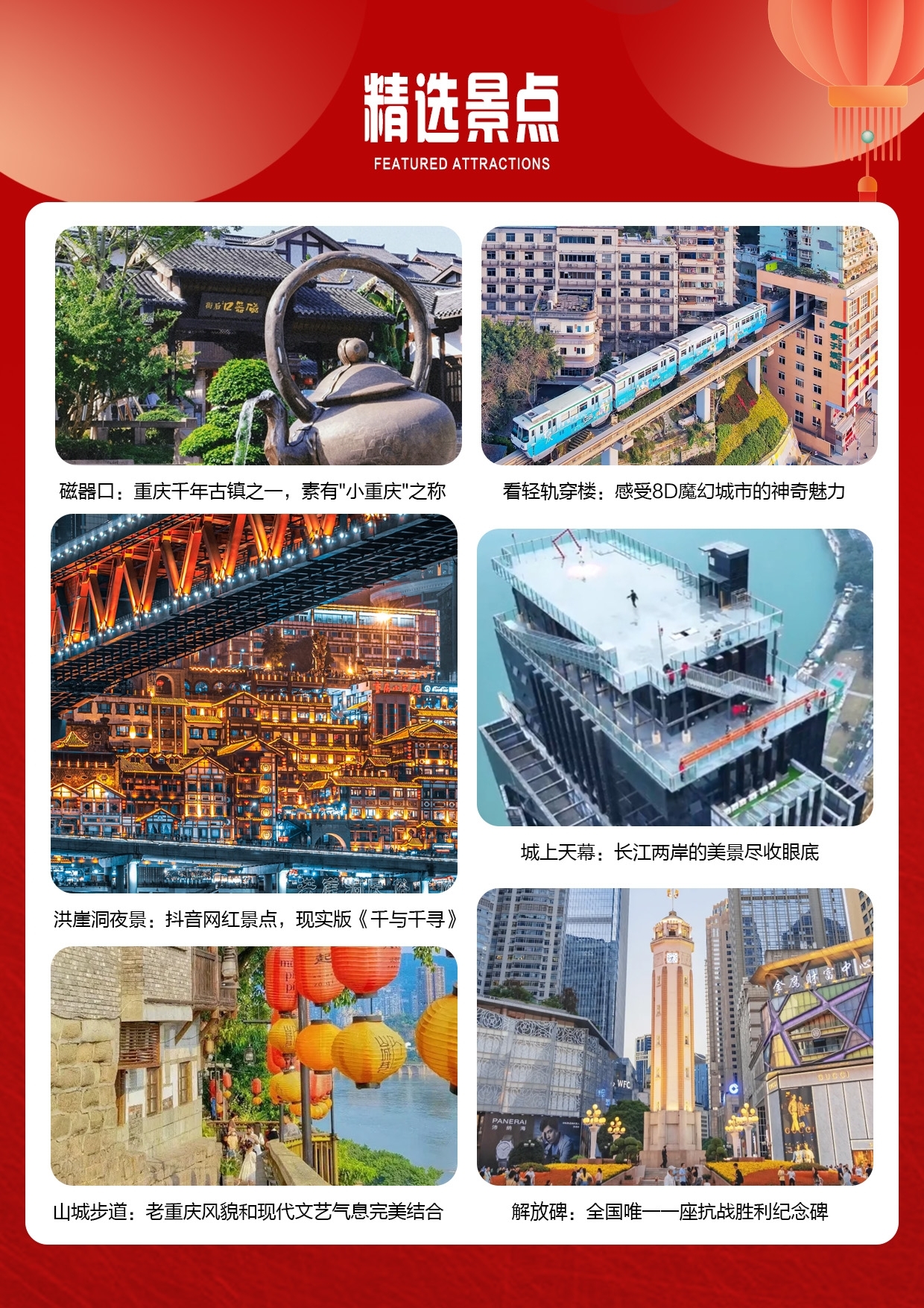 游览国家AAAA级景区千年古镇【磁器口】(游览时间不低于60分钟)一条石板路,千年磁器口,又名“小重庆”。古有民谣“白日里千人拱手,入夜后万盏明灯”便说明了此处的繁荣,磁器口 蕴含了丰富的文化及各类小吃,走进磁器口,吃麻花,喝酸奶,品地道重庆小吃,做一次本地人。