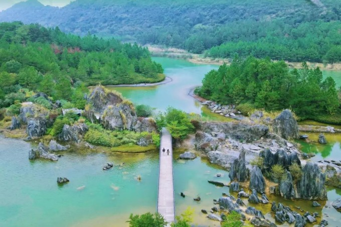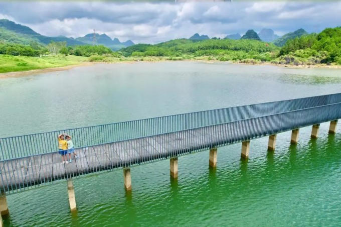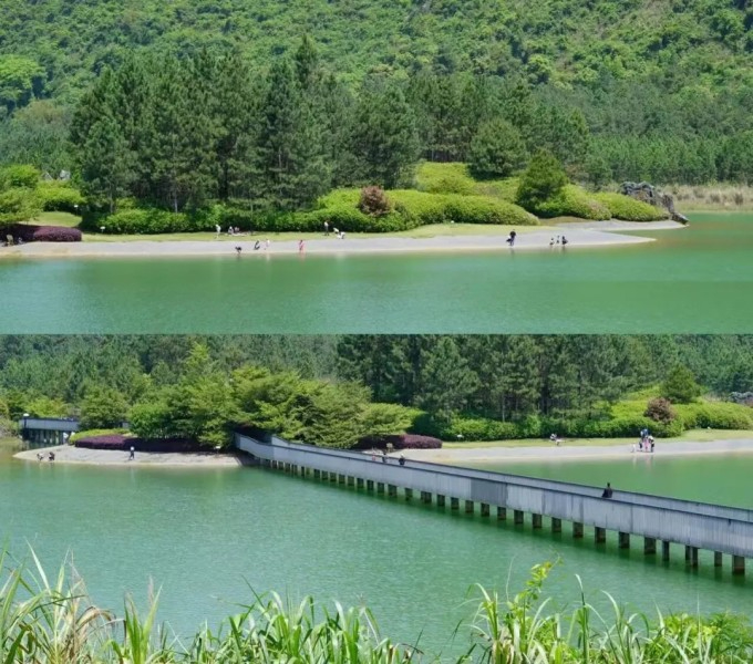 10:00 到达同心岛情人桥,跟着领队一起,沿着情人桥走进一片神秘的世界,湖水清澈如镜,四周碧草如茵,来个两公里休闲徒步拍照,大口吸氧;