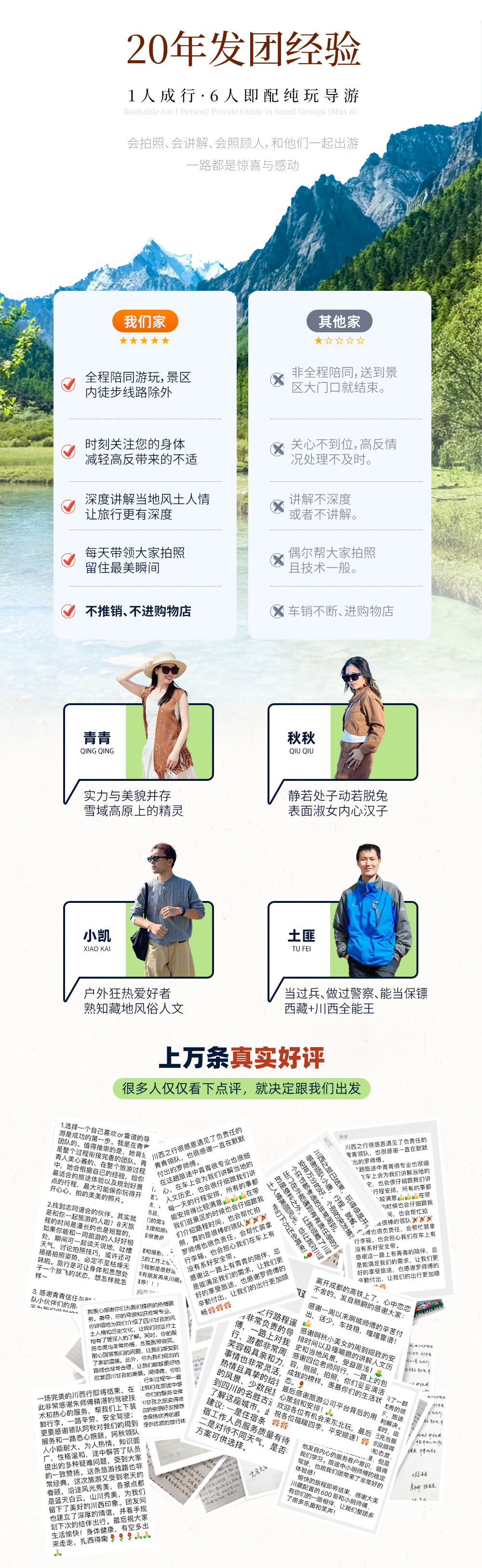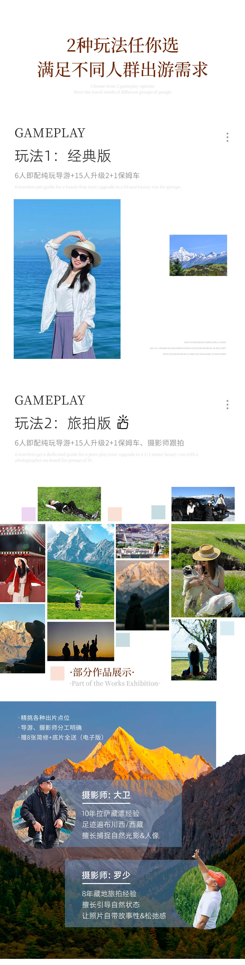 【旅拍版】:6人即配纯玩导游,15人即升级保姆车+摄影师跟拍,20人封团。