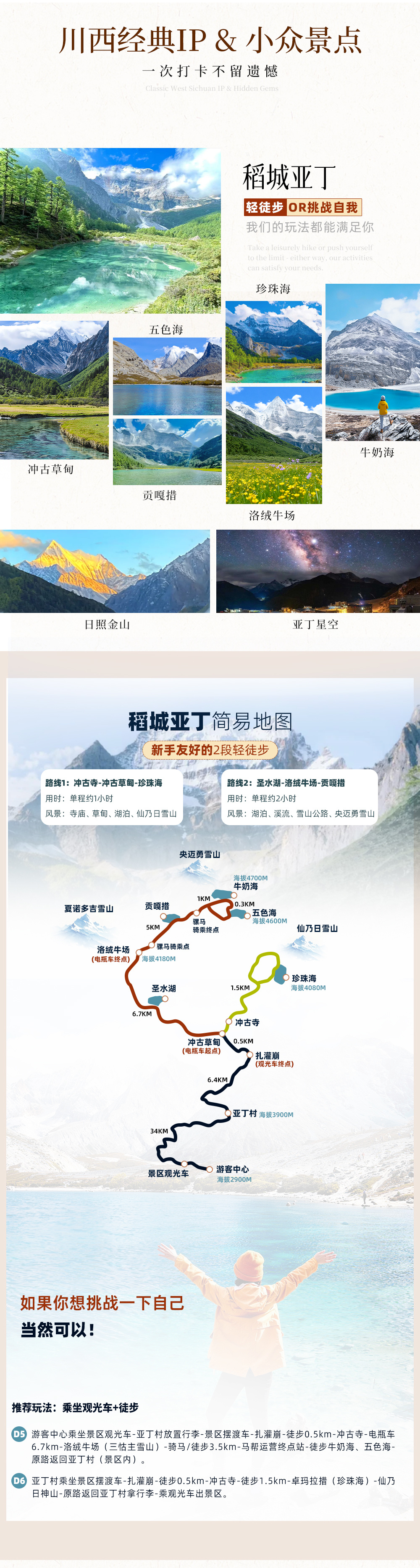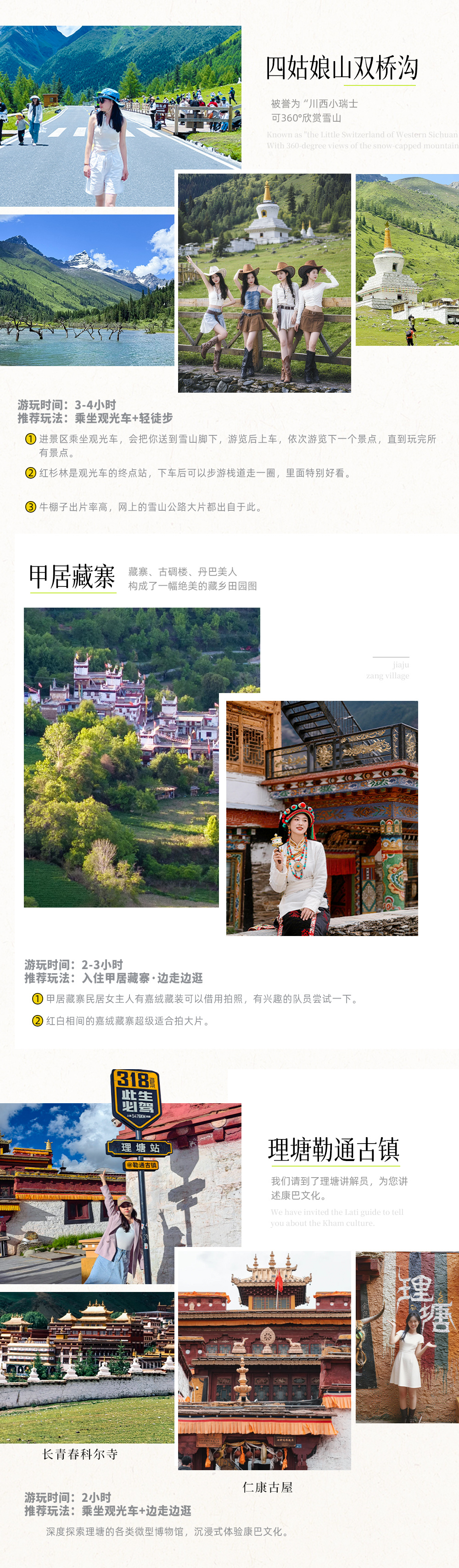 4、景交:四姑娘山观光车70元/人(必须),甲居藏寨观光车35元/人(必须),墨石公园观光车20元/人(必须),塔公草原35元/人(可选),稻城亚丁观光车120元/人(必须)、稻城亚丁游览车70元/人往返(可选);