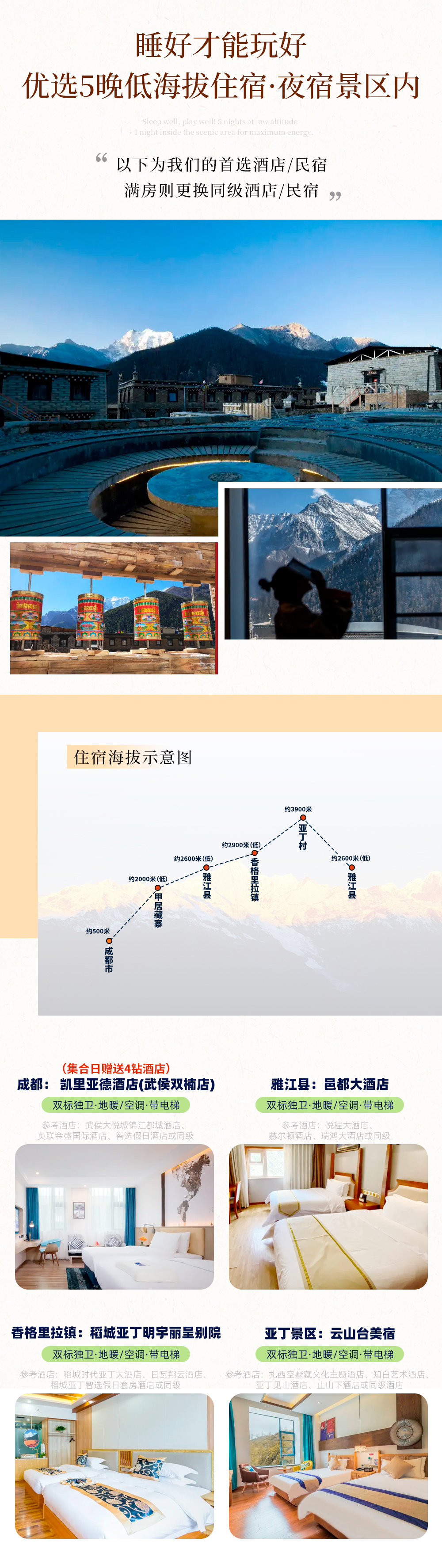 (1)我社为队员们提供了性价比高的住宿,尽管如此,队员们应该有充分的心理准备,稻城亚丁沿途人烟稀少,基础建设有限,沿线酒店多未评定星级,因处于高原地带,水、电资源缺乏,有时候也会遇到停水、停电的情况,请提前准备好手电筒,要做好不能洗澡、洗头、洗脸的准备,特别爱干净的队员,可以携带睡袋内胆,以备不时之需;